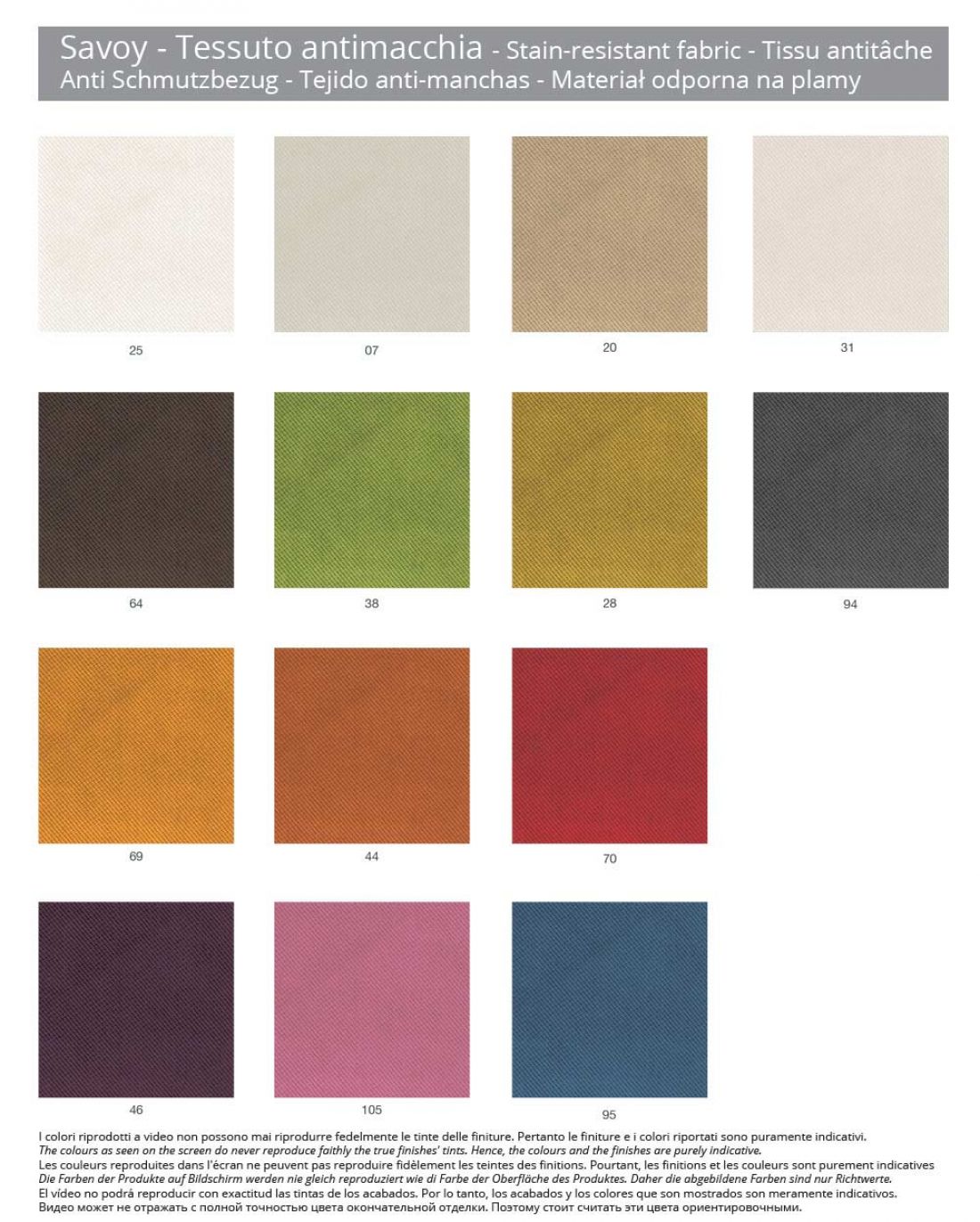 - Tejido Savoy resistente a las manchas ; Savoy es un tejido de diseño moderno, agradable al tacto y muy resistente al desgaste y a la abrasión. La característica principal de este tejido es su total impermeabilidad al agua: de hecho es gatantito como "repelente al agua". 89% Poliéster, 8% Poliamida, 2% Algodón, 1% Viscosa.
