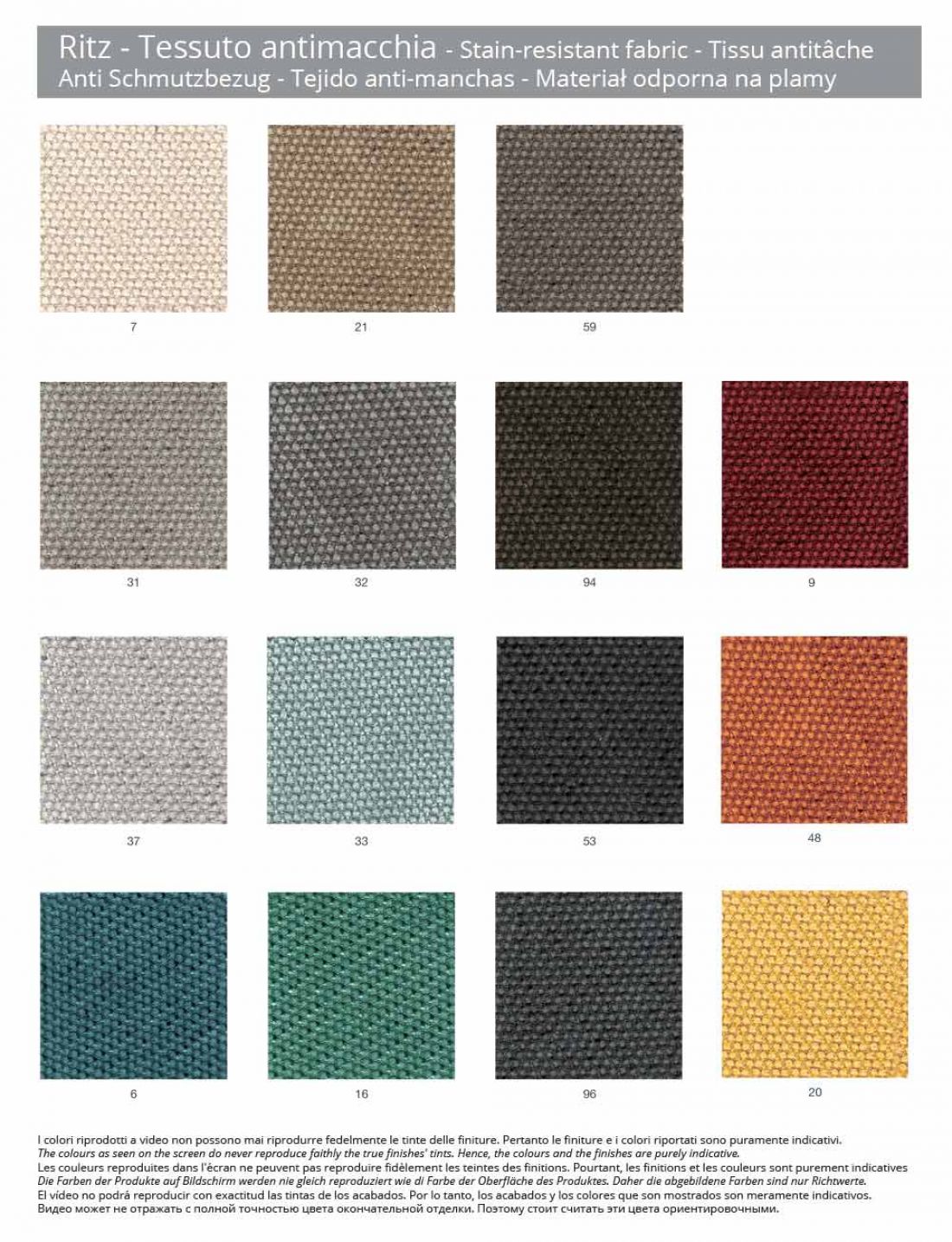 - Tejido antimanchas Ritz ; Ritz es un tejido agradable al tacto, seleccionado como revestimiento para estos asientos gracias a su característica resistencia al desgaste. Es un tejido anti-manchas compuesto por 86% Poliéster, 14% Poliamida. Peso / espesor 490 gr / mtl.