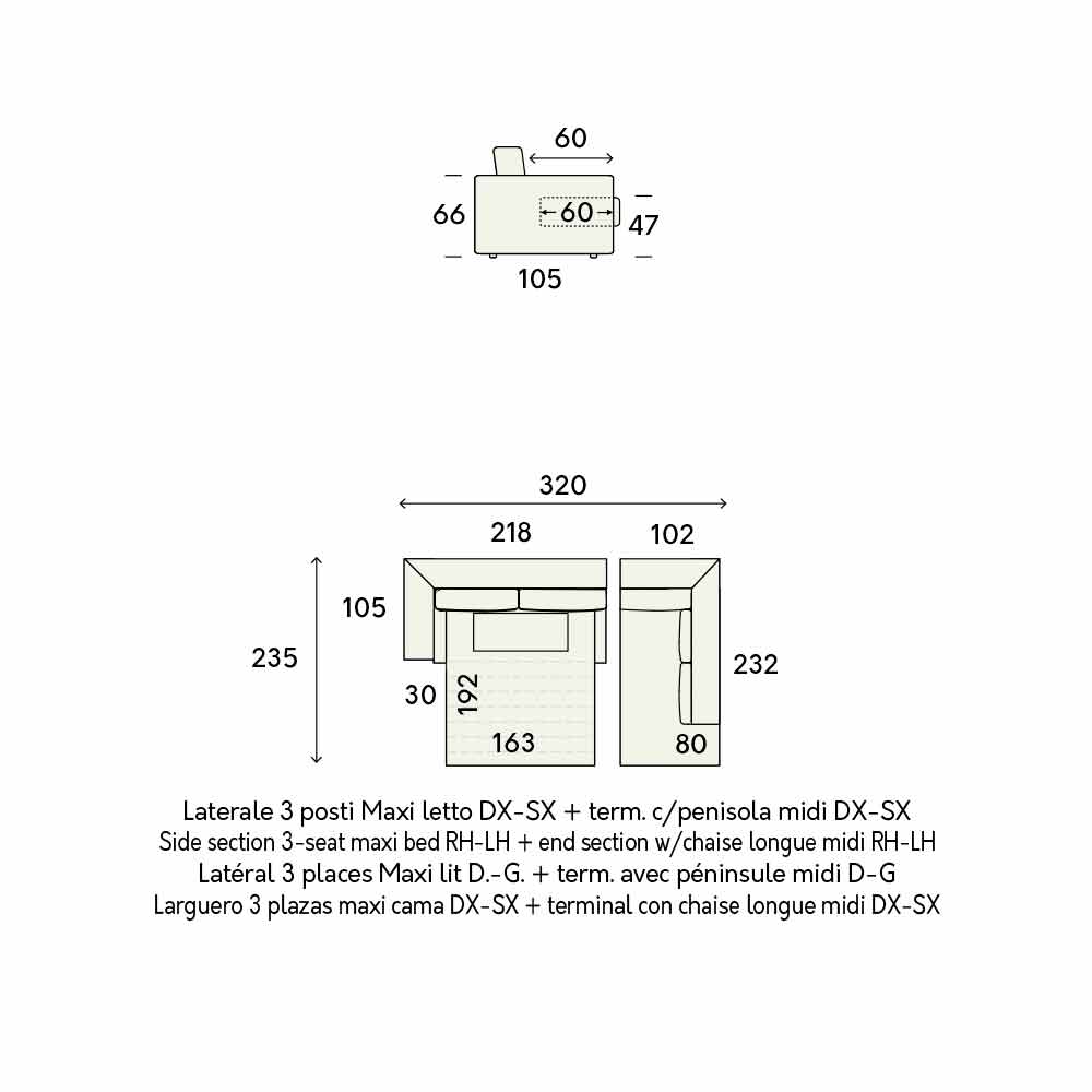 • L 320 x P 235 x H 85 cm (colchón: L 163 x P 192 x H 11 cm).