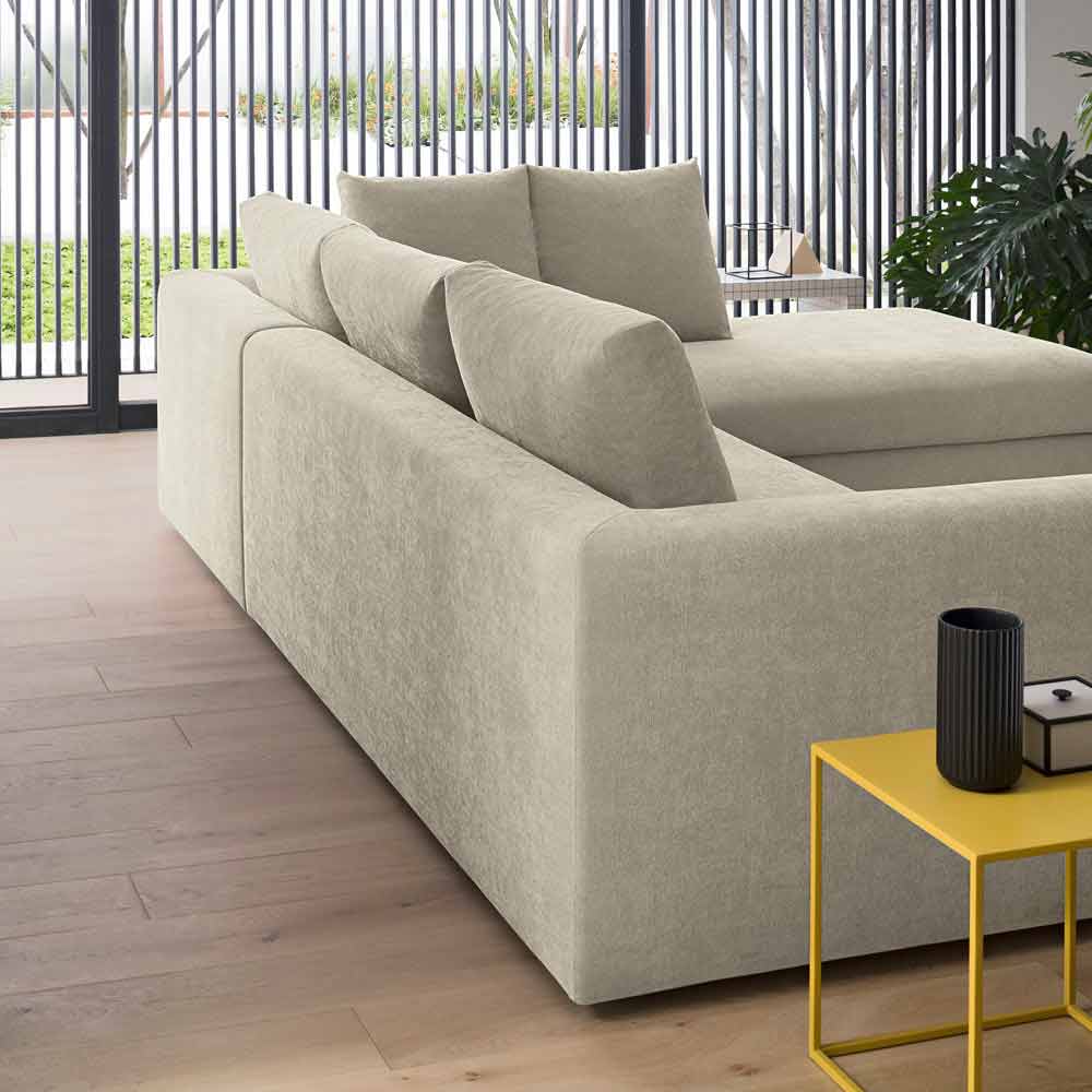 Sofá cama rinconera fabricado íntegramente en Italia con relleno de espuma de poliuretano indeformable , tapizado en tejido beige (completamente desenfundable) con pies en abs negro. Formas simples, líneas limpias y un diseño sólido y práctico hacen de este complemento una solución de decoración perfecta para completar ambientes contemporáneos con un estilo refinado. Sus dimensiones lo convierten en un sofá de tamaño familiar sumamente elegante y acogedor enriquecido por la gran chaise longue que ofrece el confort ideal para disfrutar de maravillosas veladas con amigos o dejarse mimar por el cálido y suave abrazo de su acogedor diseño. Rápido y fácil de preparar, este sofá se transforma en una espaciosa y cómoda cama doble para dos personas más un espacio adicional que ofrece la chaise longue que le permite acomodar hasta 3/4 personas como parejas con niños. Un diseño que dirige su atención a la funcionalidad pero sin dejar nunca de lado el aspecto visual fundamental que lo hace capaz de caracterizar grandes salones con un gusto exclusivo, dando un toque refinado al entorno.