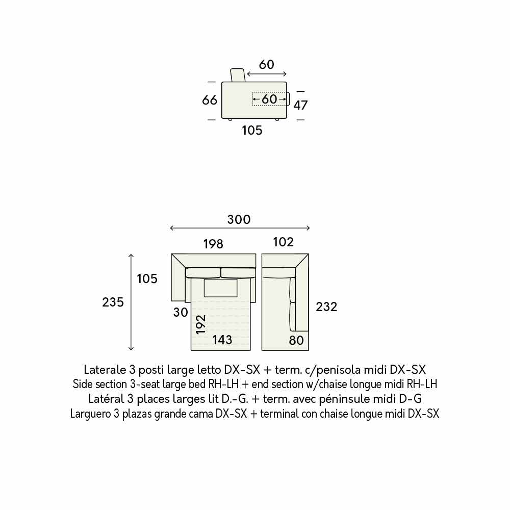 • L 300 x P 235 x H 85 cm (colchón: L 143 x P 192 x H 11 cm):
