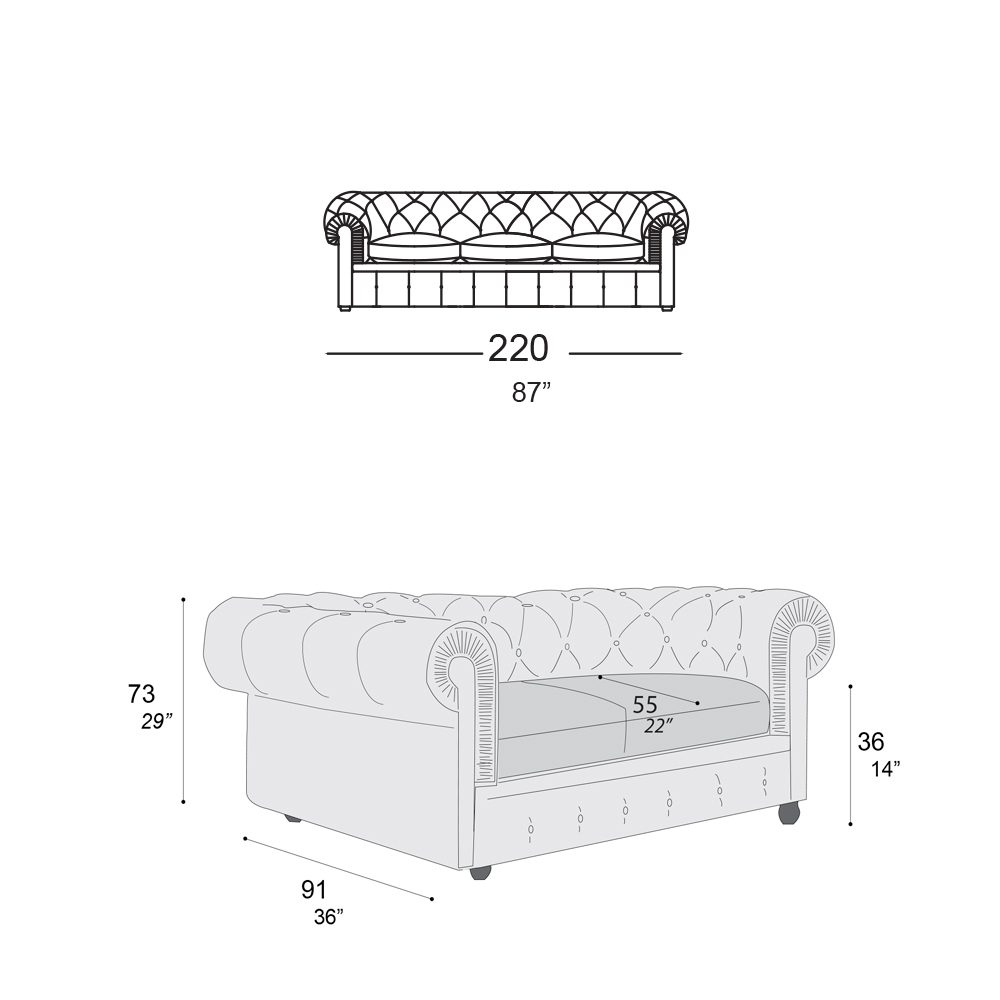 Sofá de salón fabricado con estructura compuesta por madera maciza y contrachapado . El acolchado de la propia estructura es de espuma de poliuretano D.40 y fibra de poliéster . Muelles con correas elásticas de elasticidad controlada montados en sistema cruzado.