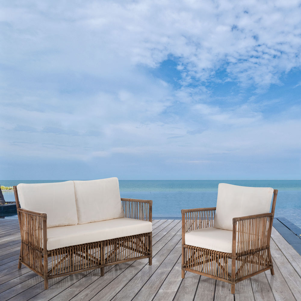 Este sofá de ratán es un tesoro de calidez natural y elegancia confortable . La estructura de ratán tejido, rica en encanto rústico y hecha a mano por expertos, ofrece no sólo durabilidad y resistencia a los elementos , sino también una estética cálida y acogedora que invita a la relajación. Los gruesos y suaves cojines garantizan un confort inigualable, perfecto para disfrutar de momentos de serenidad al aire libre.