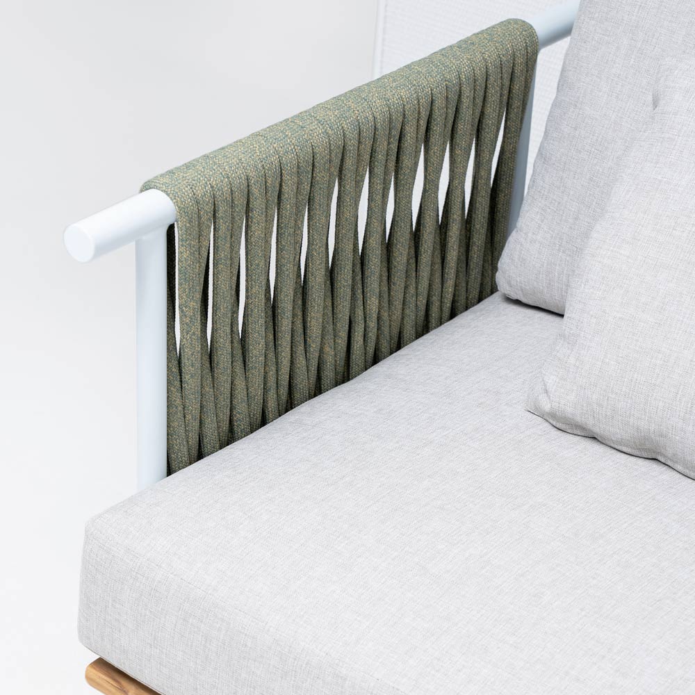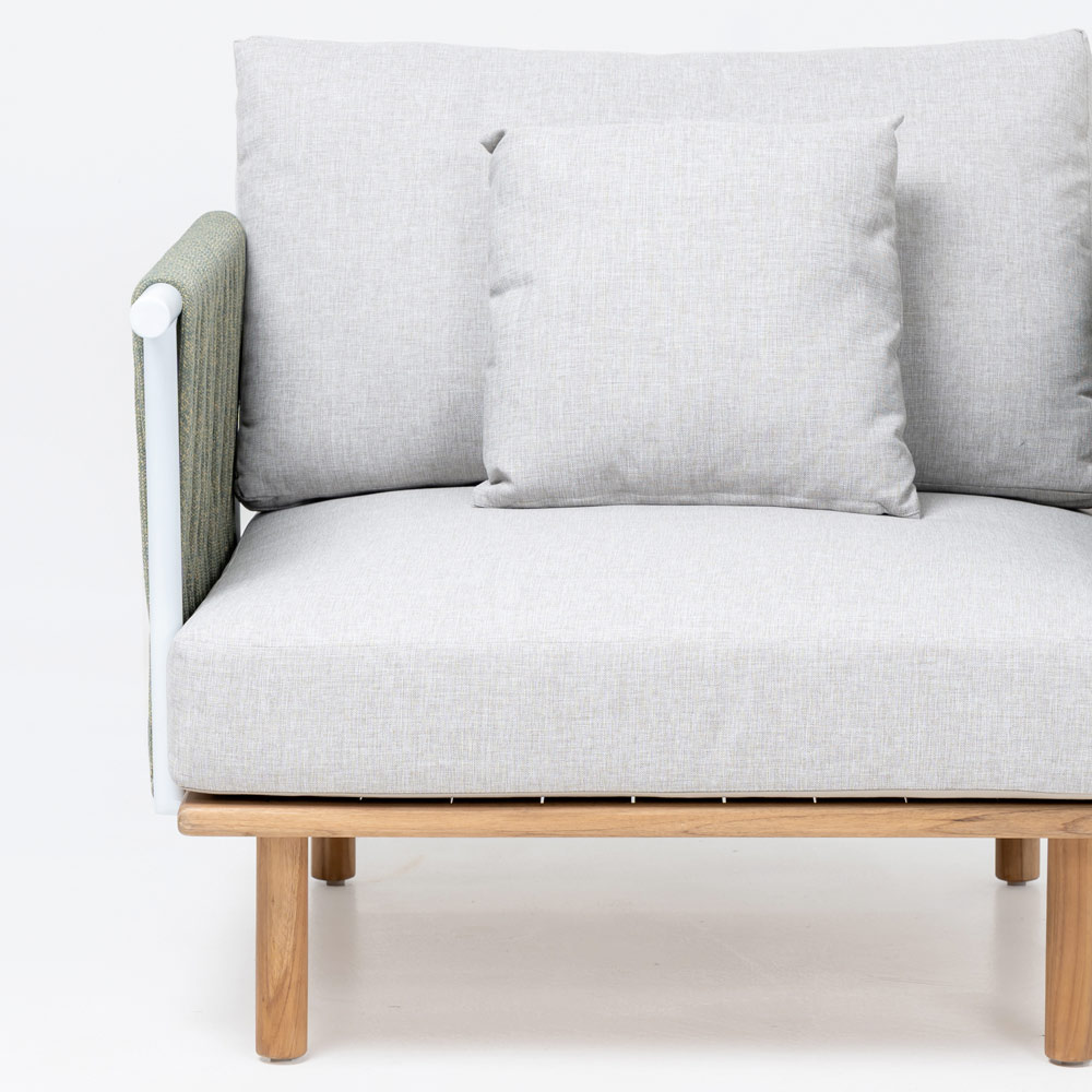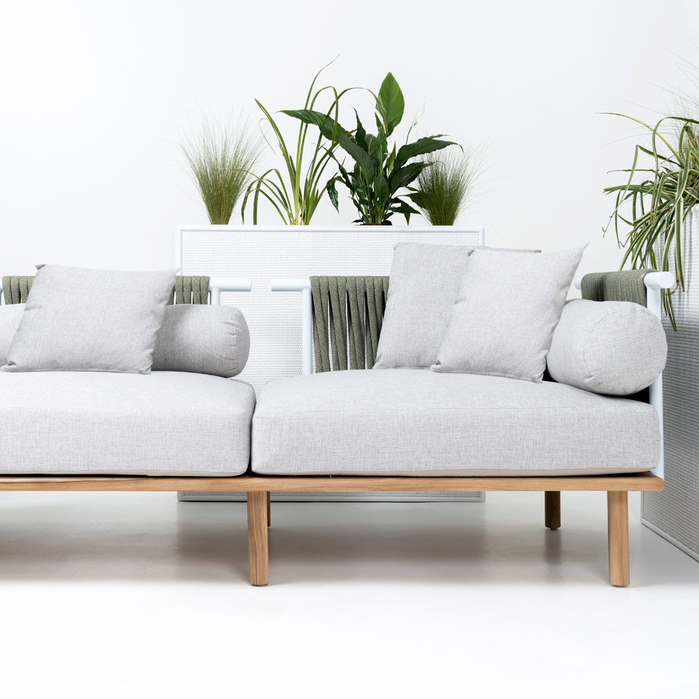 Sofá de exterior fabricado con 2 estructuras de teca y 4 cojines de asiento en tejido de olefina gris claro , 4 respaldos desenfundables en aluminio y tejido en Olefina/PP ROPE con acabado desert mix .