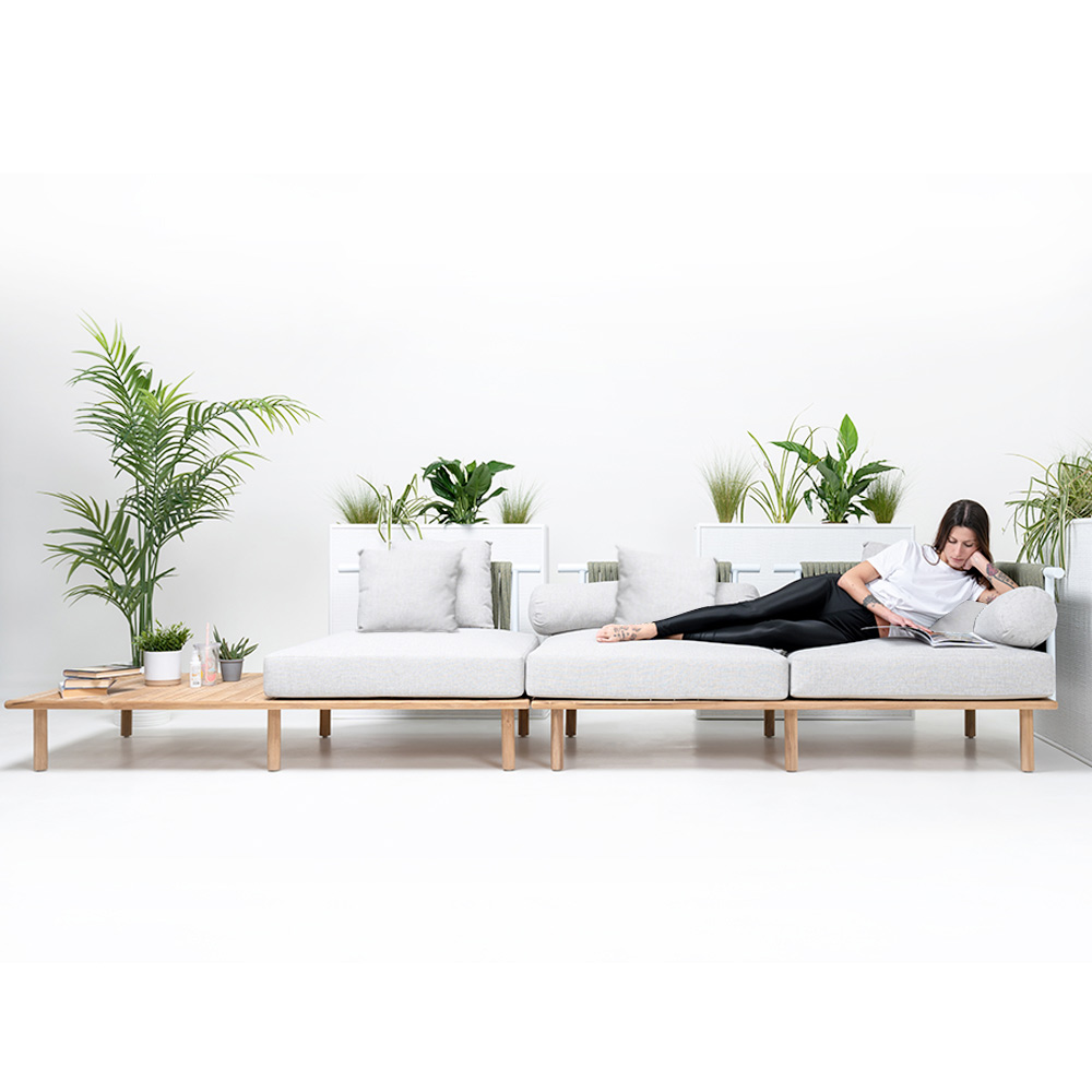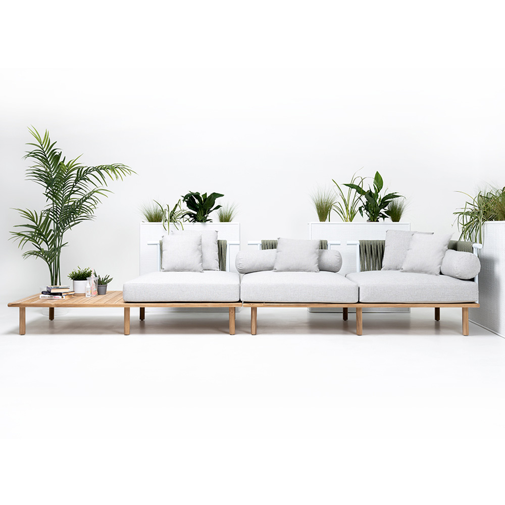 Sofá de jardín modular en teca, respaldos de aluminio y tejido en Olefina/PP ROPE y cojines