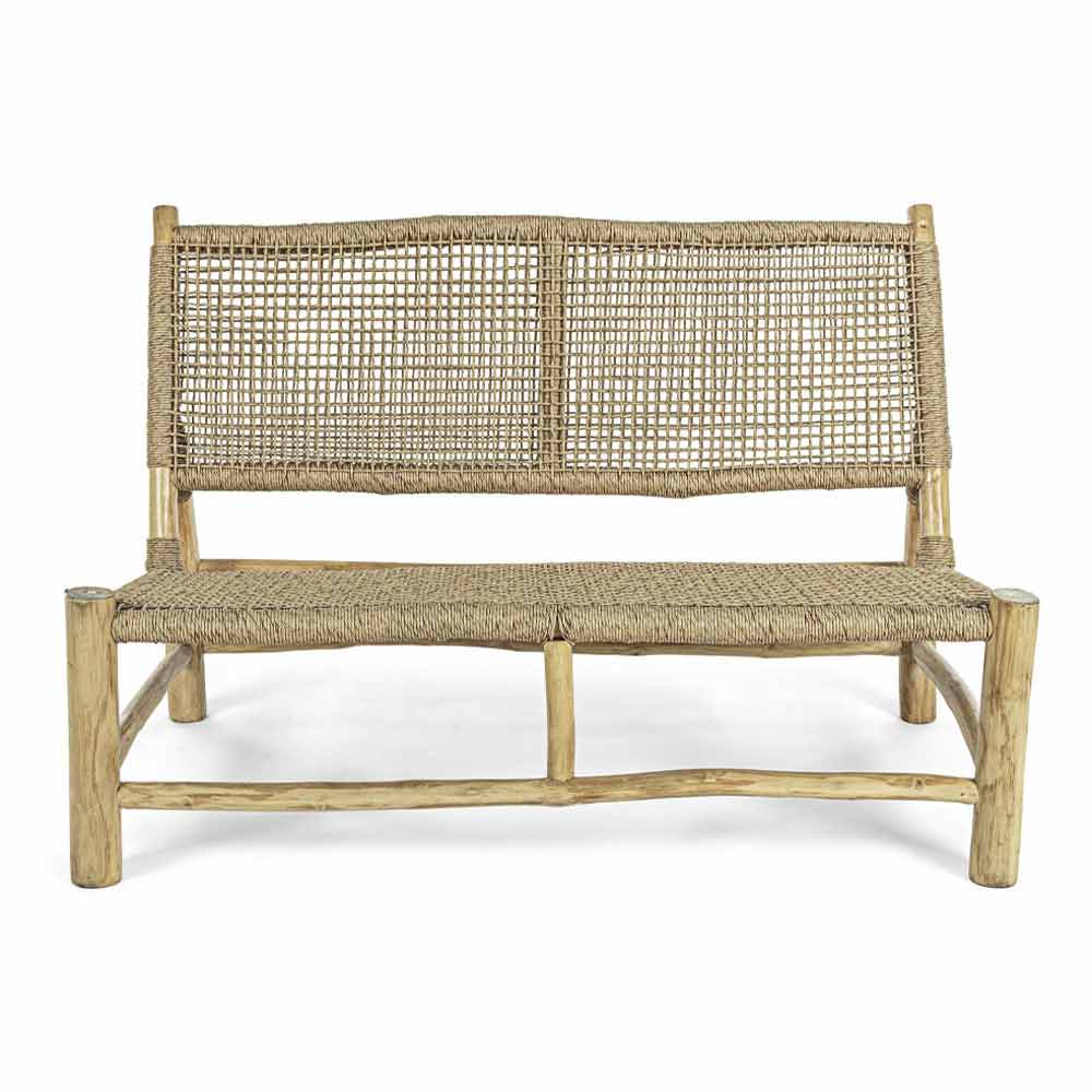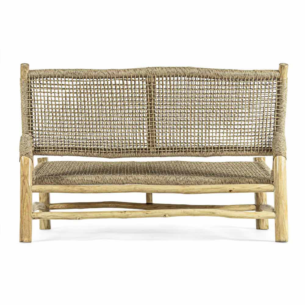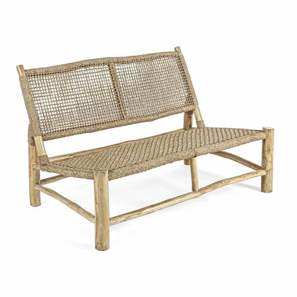 Sofá de exterior de 2 plazas en ramas de teca con asiento y respaldo en fibra.