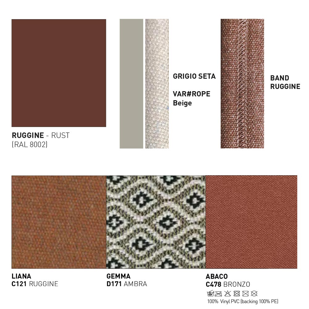 Sofá de jardín de 3 plazas fabricado en Italia con estructura de aluminio pintado con polvos epoxi color óxido , respaldo tejido a mano con banda color óxido, cojín del asiento con acolchado dryfeel y 8 cojines de respaldoincluido. Este mueble de estilo moderno y original ha sido diseñado para satisfacer la vista con su estética elegante garantizando al mismo tiempo un auténtico confort .