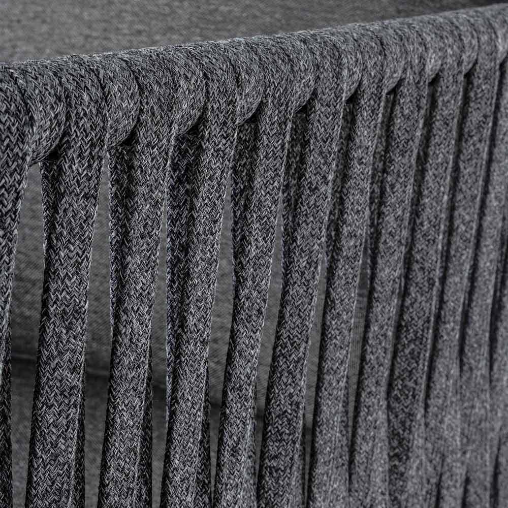 Estructura de aluminio pintado en polvo (poliéster). Tejido con cordones de Tetoron (100% poliéster). Cojines de asiento y respaldo desenfundables con tejido Olefin (100% polipropileno).