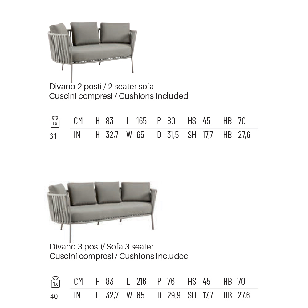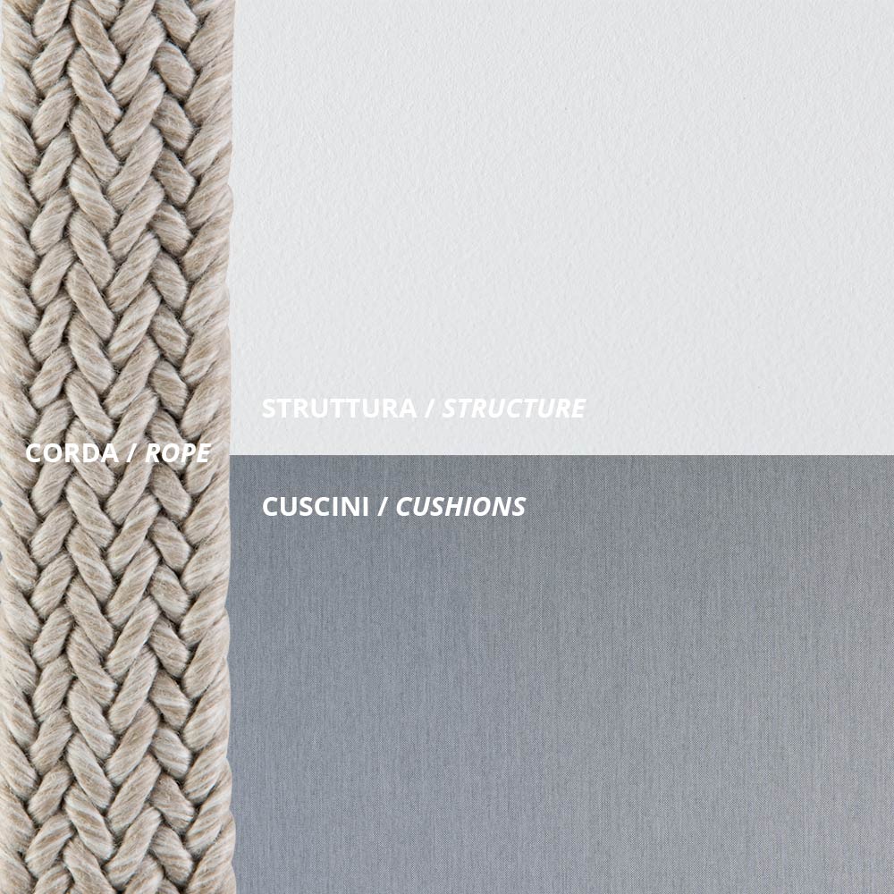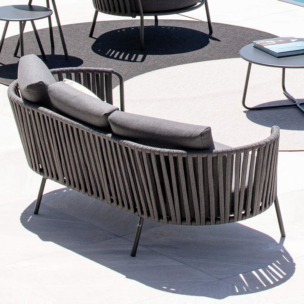 resistencia del acabado a los agentes atmosféricos corrosivos, mientras que la cuerda es resistente al cloro, a la luz solar y al moho. Los cojines están fabricados con material resistente a los rayos UV y al agua, lo que mantiene el color durante mucho tiempo, lo que convierte al sofá en un elemento perfecto para amueblar cualquier espacio exterior.