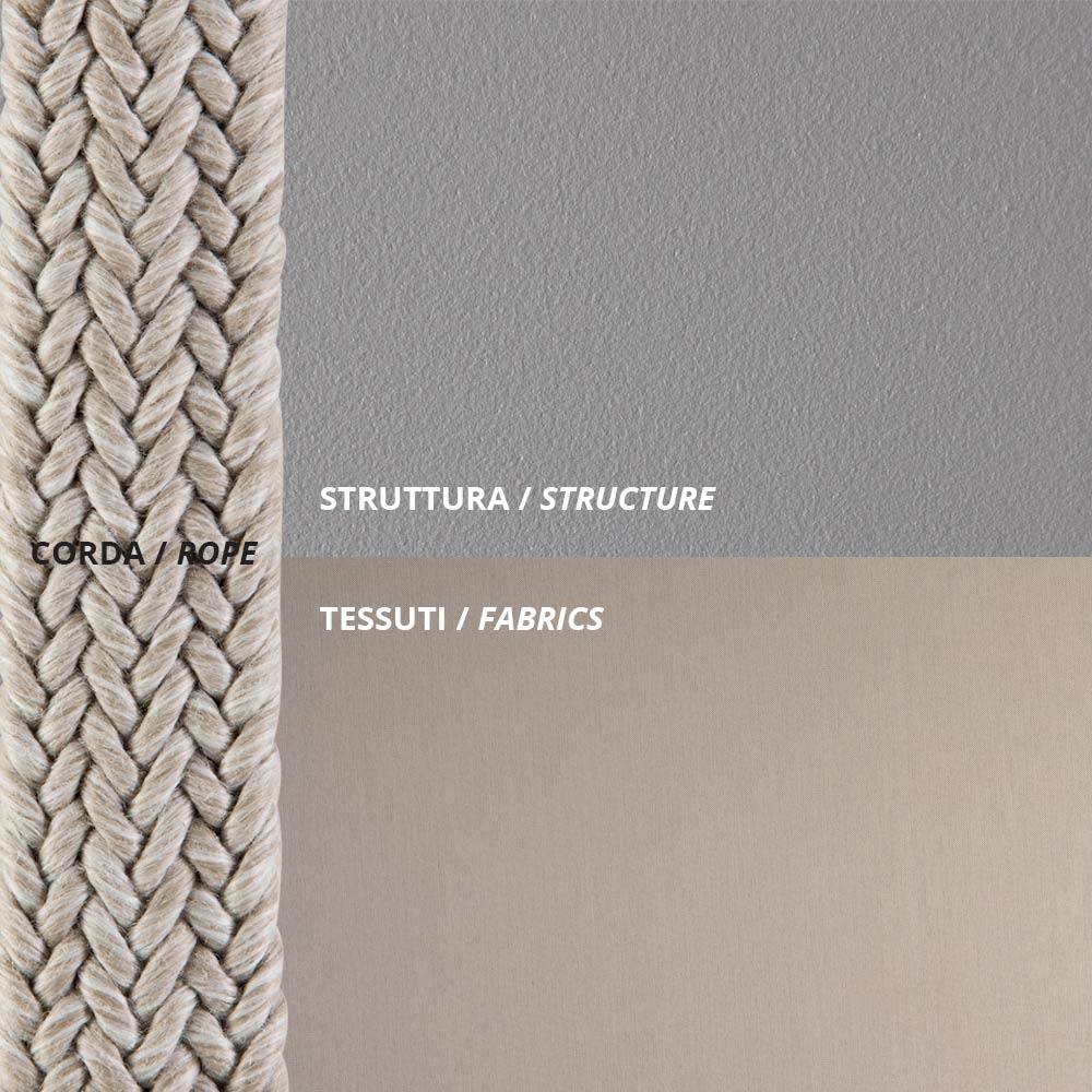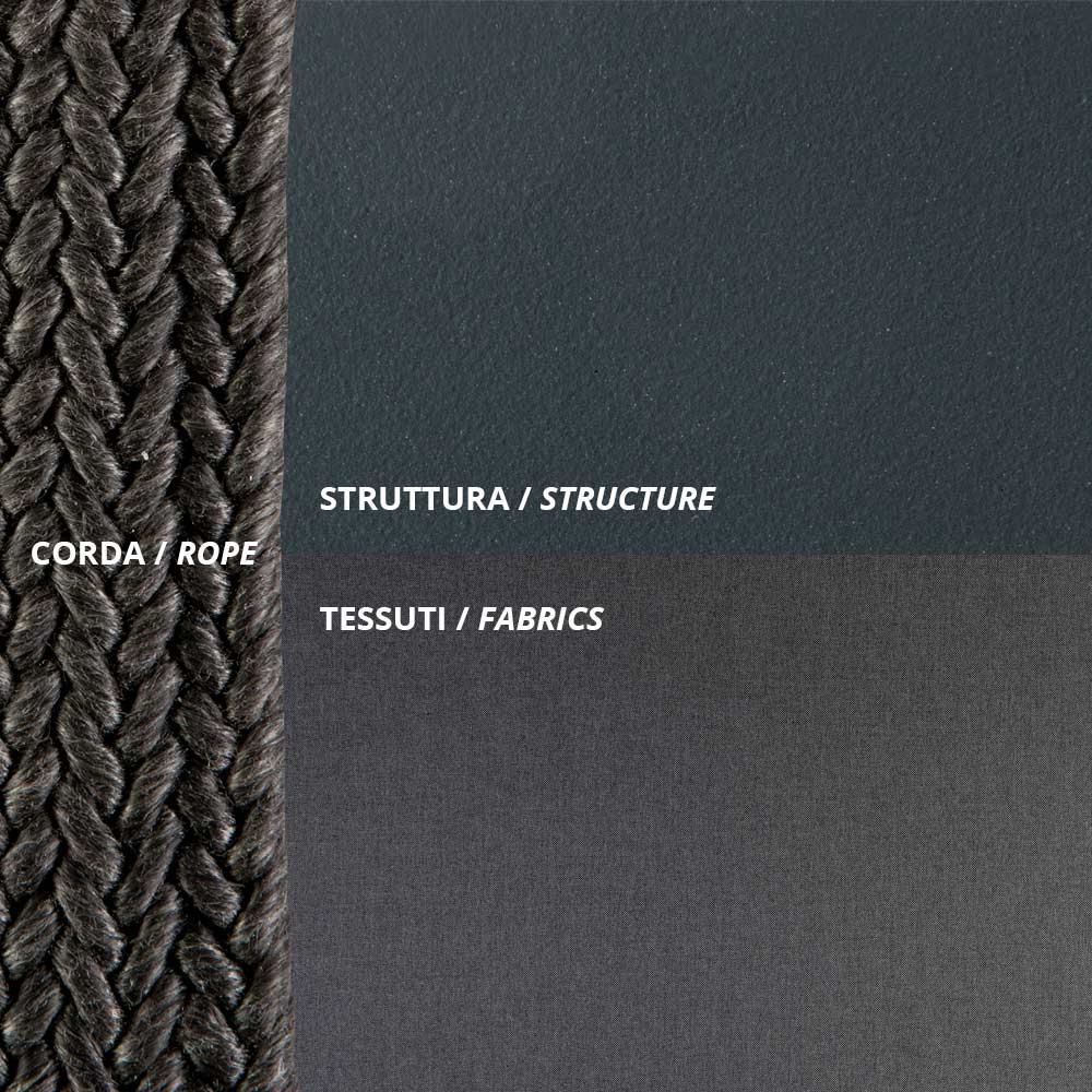 - Estructura: gris antiguo, cuerdas: negras, cojines: antracita