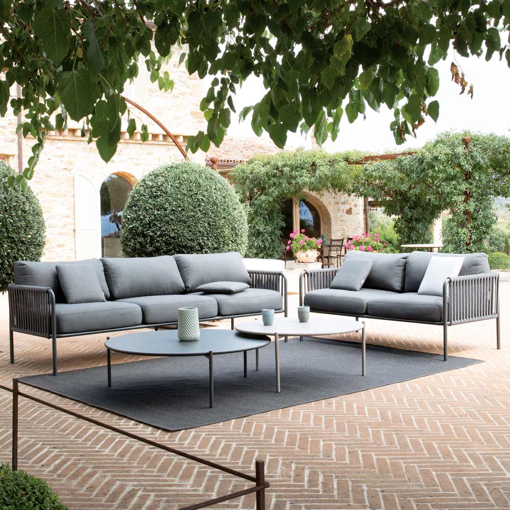 Sofá de jardín en acero y cuerda de varios tamaños con cojines Made in Italy.