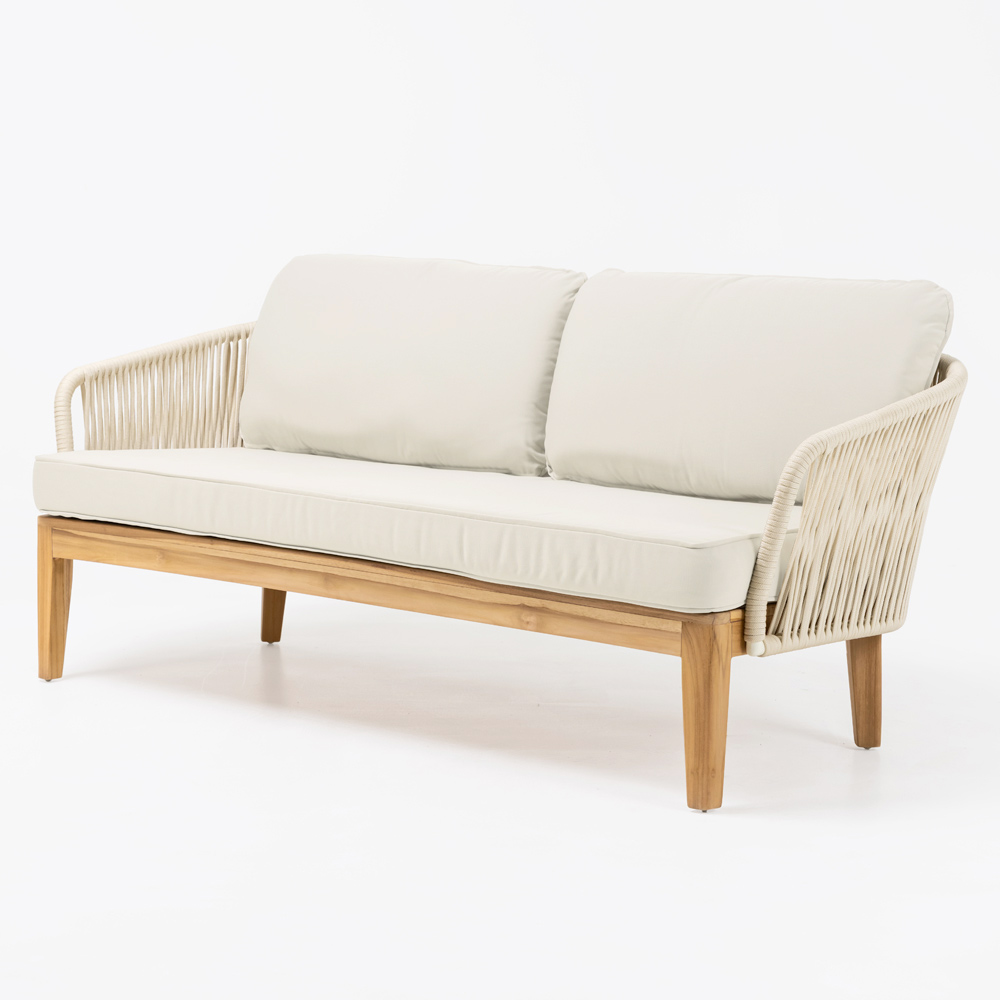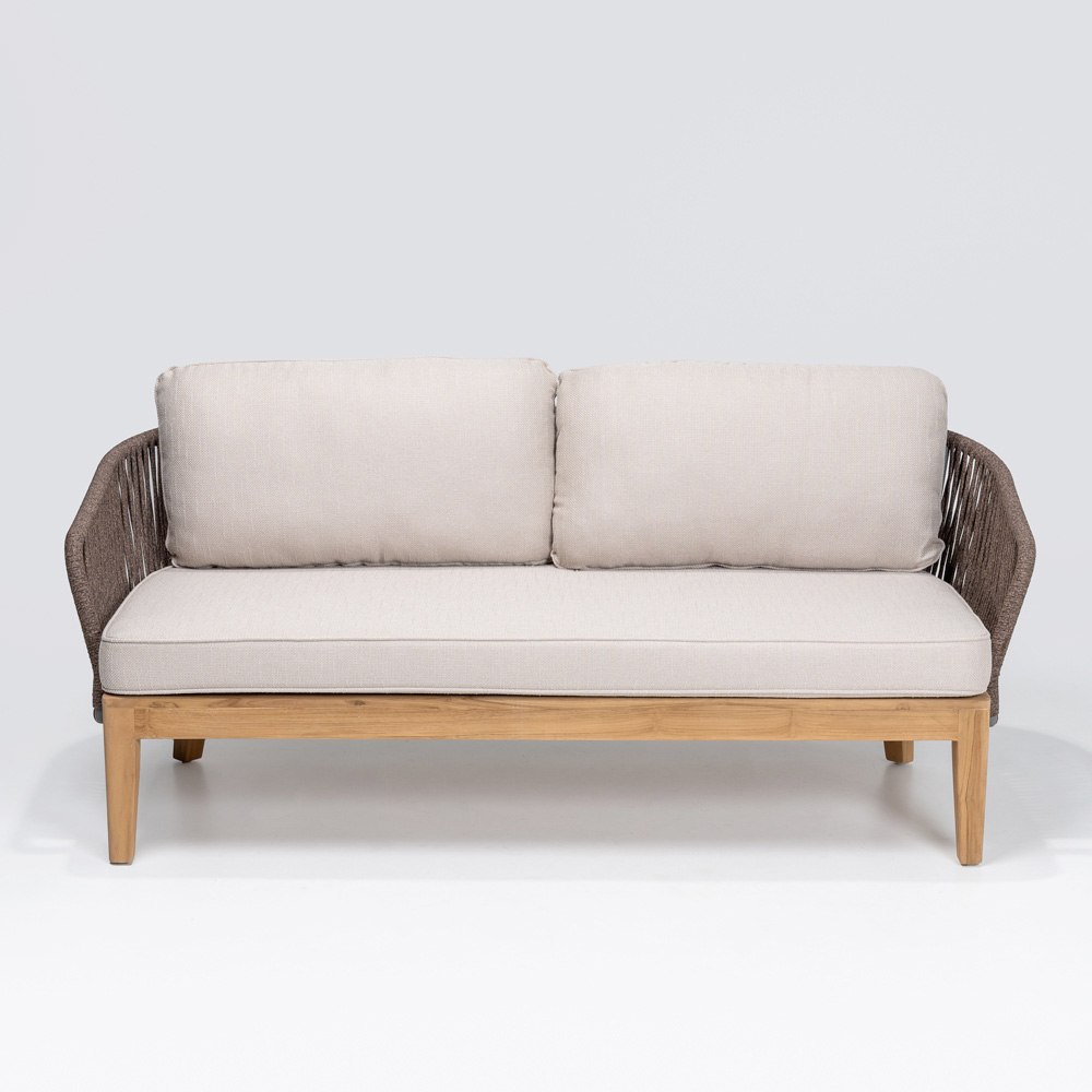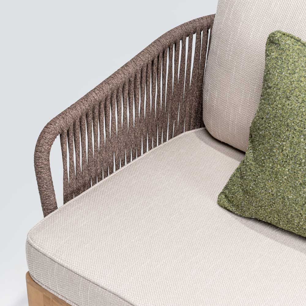 Este sofá está fabricado en madera de teca con acabado natural y tejido