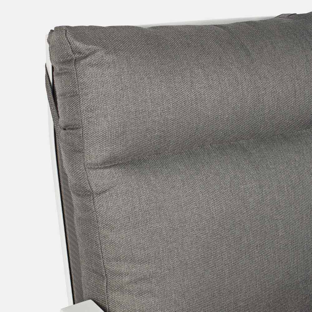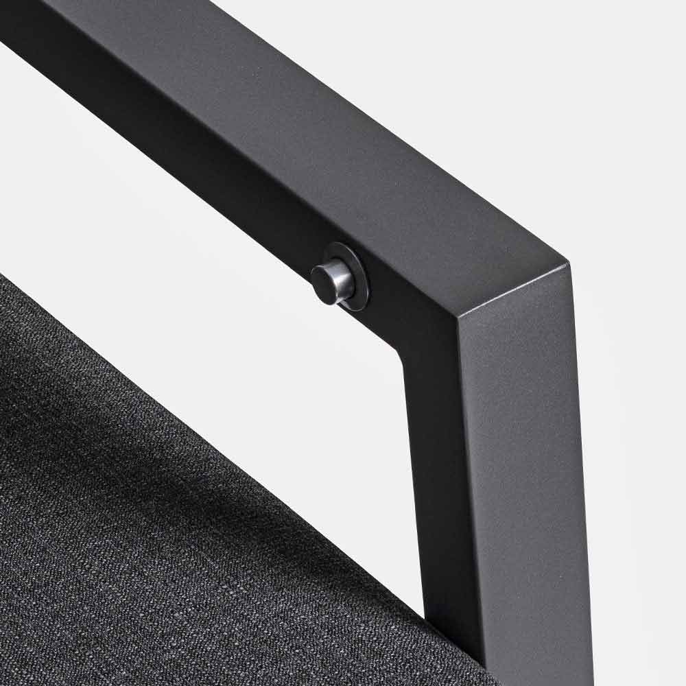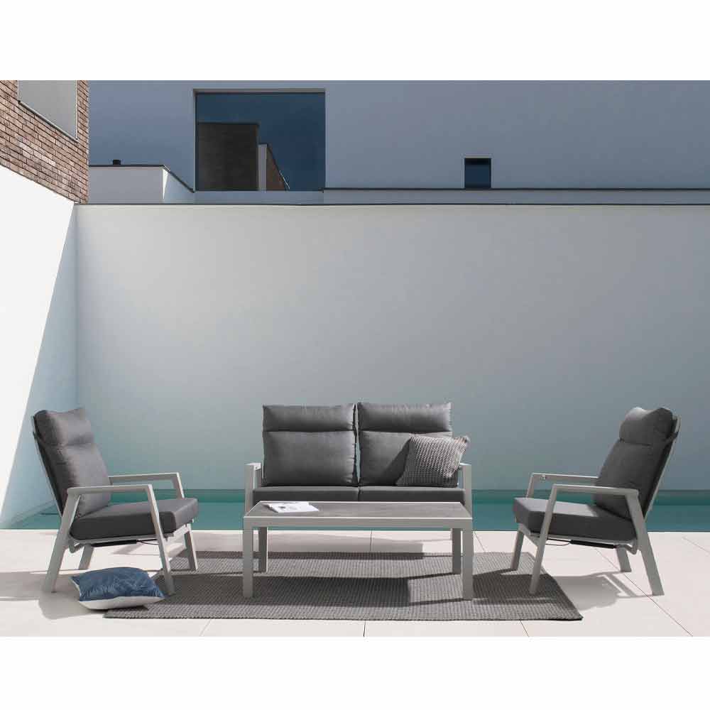 Estructura de aluminio pintado en polvo (poliéster). Respaldo reclinable en posición libre y asiento en textilene 1x1. Cojines desenfundables con tejido de olefina (100% polipropileno).