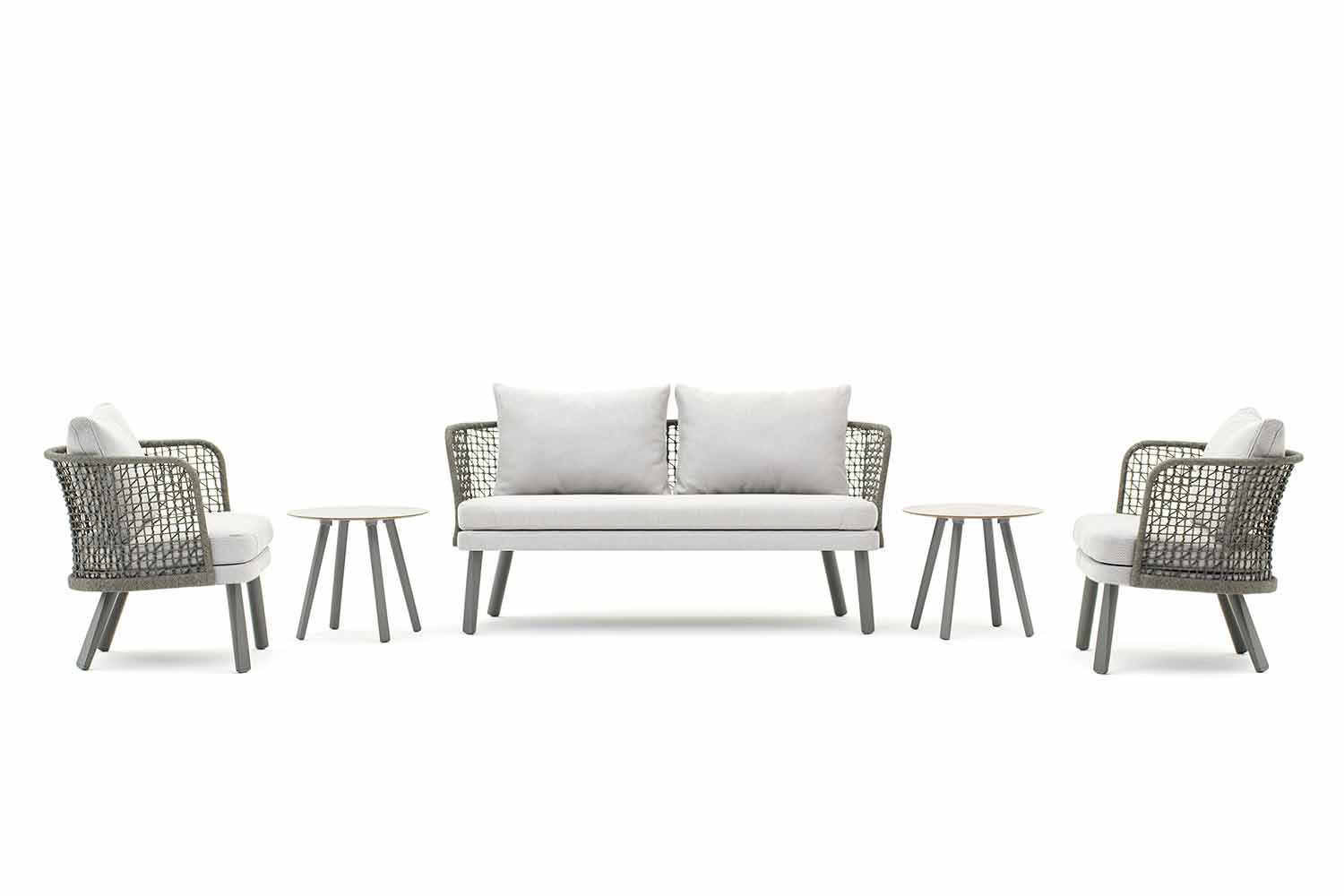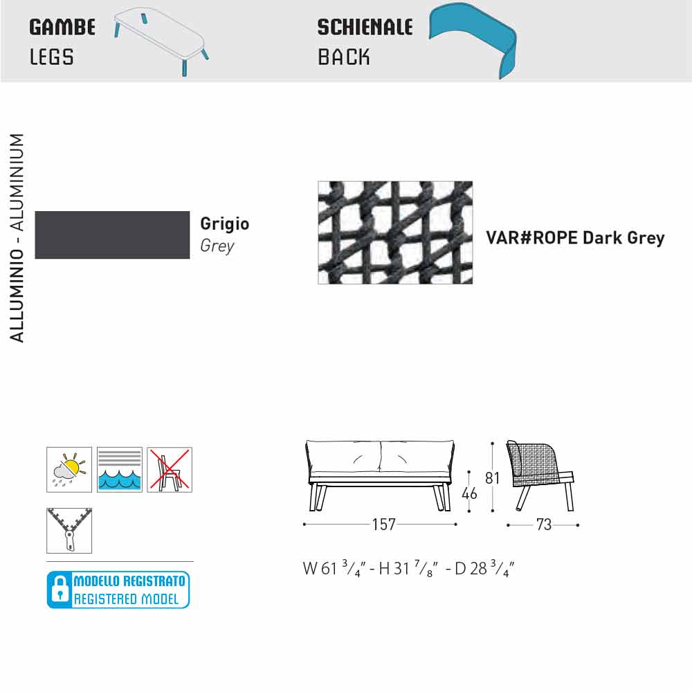 Emma es un emocionante sofá para exteriores que se caracteriza por una estructura de fibra sintética tejida a mano con un marco de aluminio con recubrimiento de polvo gris oscuro . También viene con patas en aluminio pintado de color gris y un asiento acolchado con caucho de Dryfeel cubierto en tela. Gracias a su delicadeza entrelazada con un diseño contemporáneo, será perfecta para decorar ambientes al aire libre como terrazas, piscinas, jardines; Pero encuentra la colocación perfecta también en el interior, en la sala de estar.