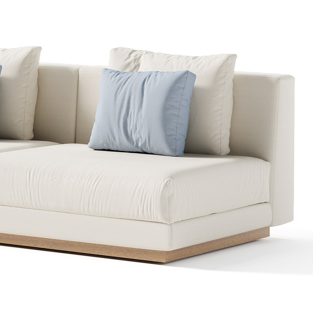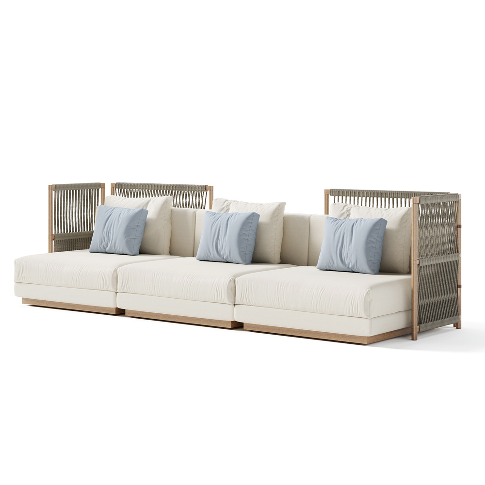 Sofá modular de jardín íntegramente fabricado en Italia con cojines de asiento y respaldo en tejido tapizado. El producto se compone de un asiento bajo y profundo y gracias a los grandes cojines se convierte en un sistema atractivo y acogedor diseñado para crear un ambiente relajado e informal. Este sofá es perfecto para hacer que cualquier ambiente sea único, ofreciendo la libertad de reescribir sus espacios de vida con gusto y estilo. Gracias a sus acabados simples y lineales, garantiza elegancia y refinamiento a cualquier ambiente en el que se coloque. La variante con la estructura en madera de iroko y trenzas de cuerda verde , gracias a su decoración, recuerda la tradición artesanal del tejido y da un toque de identidad única a la composición sin dejar de ser un elemento puramente decorativo. Esta estructura también se puede utilizar como boiserie de partición independiente.