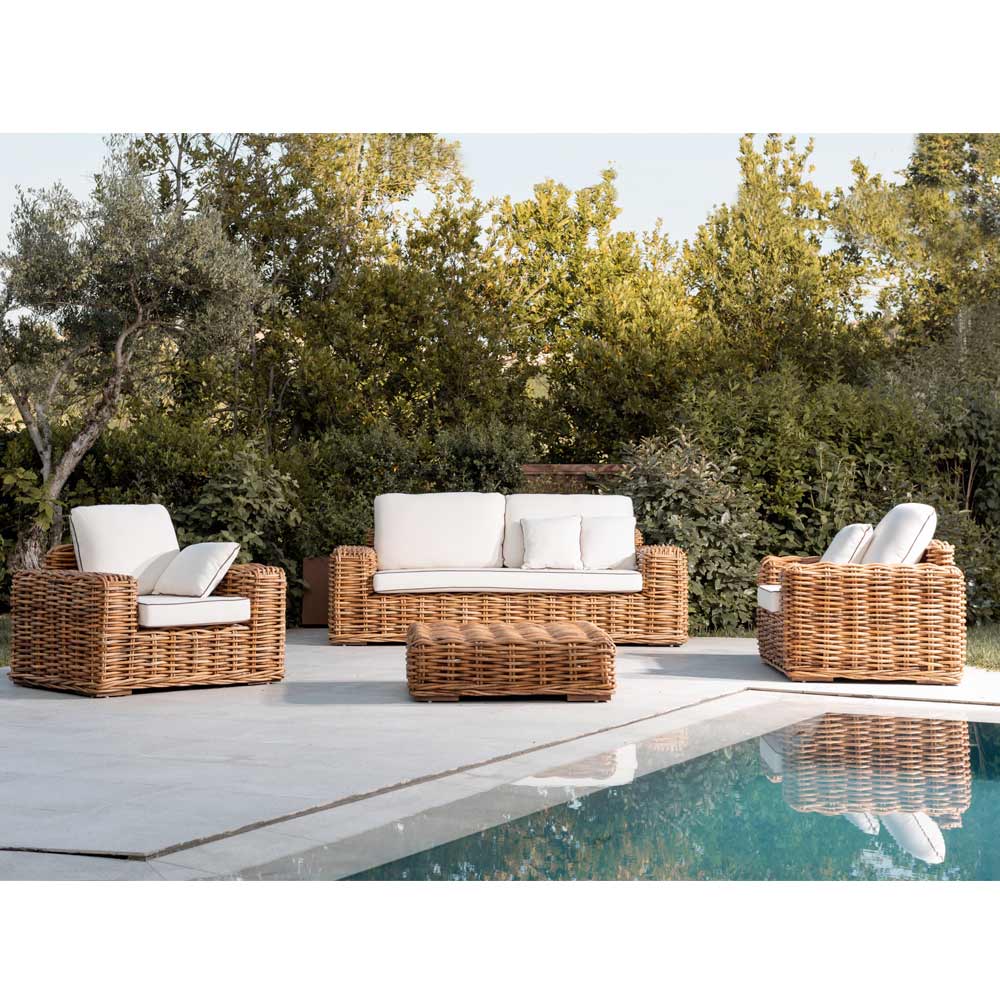 Sofá de exterior de varias medidas en ratán natural con cojines.