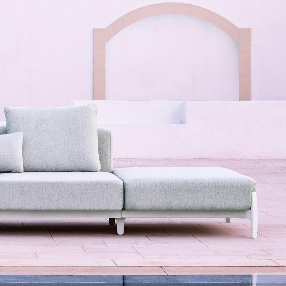 La colección se caracteriza por el detalle de la pata de aluminio como punto focal combinado con el rigor formal y modular del acolchado, para experimentar el aire libre en términos de máxima relajación y convivencia, sentado en el sofá, alrededor de una mesa o tumbado en el cama solar. .