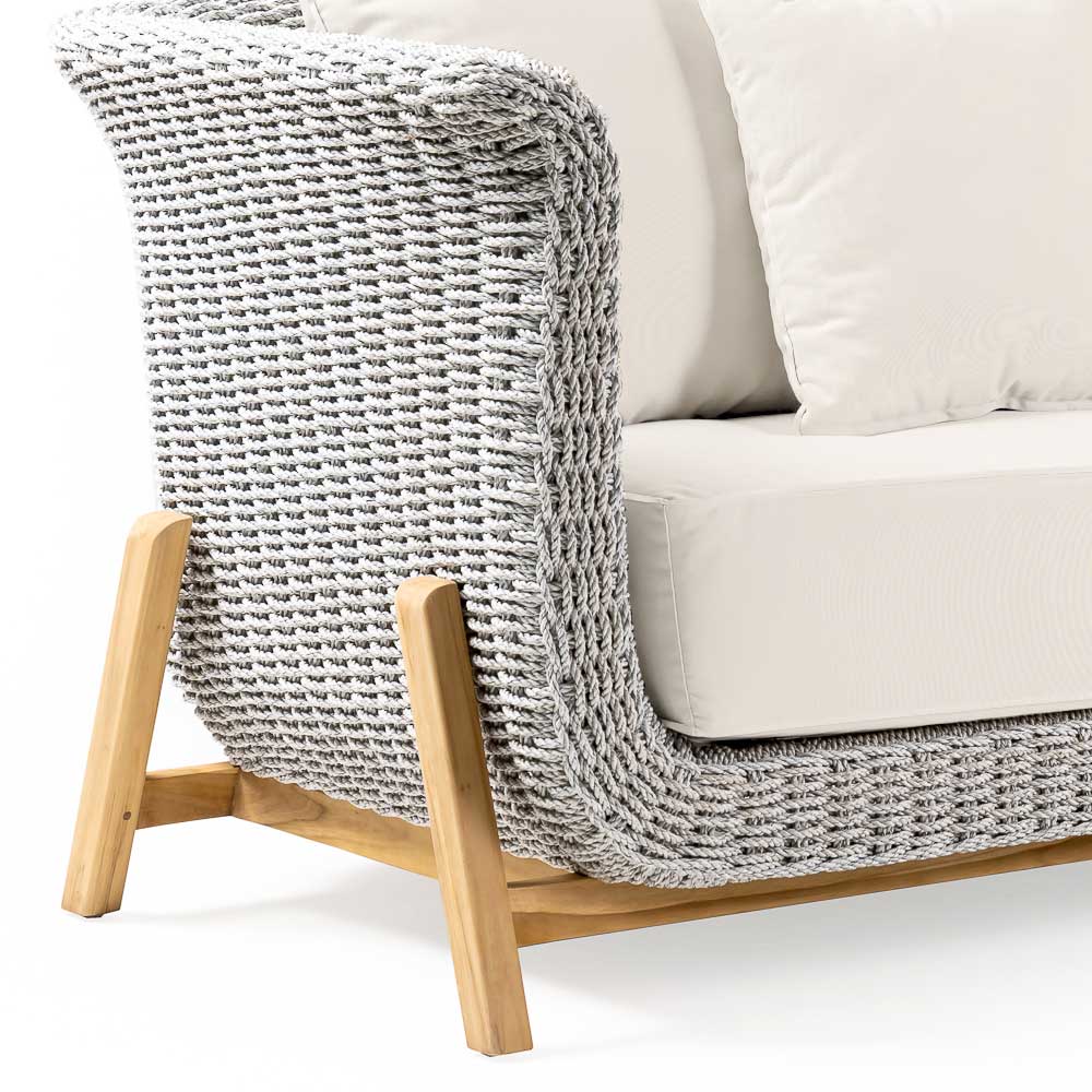 Este sofá de exterior está fabricado con una estructura interna en aluminio recubierto de polvo epoxi, frame, con base de teca e inserto de cuerda VRO tejida a mano. Se completa con cojines de asiento y respaldo en tejido gris habana repelente al agua.