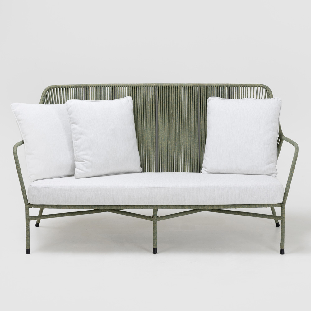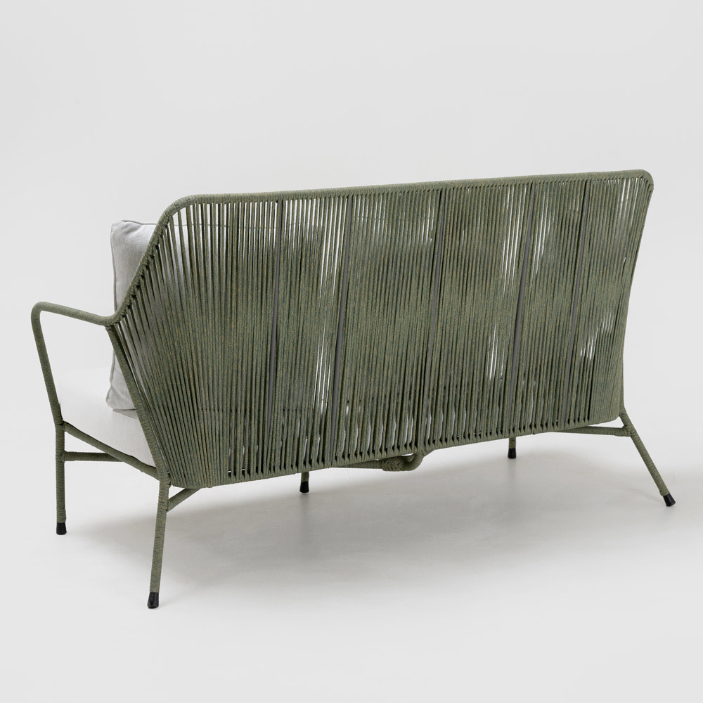 Este sofá de jardín es un remanso de relajación, ideal para disfrutar de la serenidad del exterior. Su diseño es contemporáneo, con una estructura ligera de cuerda tejida que crea un juego de transparencias y sombras, añadiendo profundidad e interés visual a su jardín o terraza.