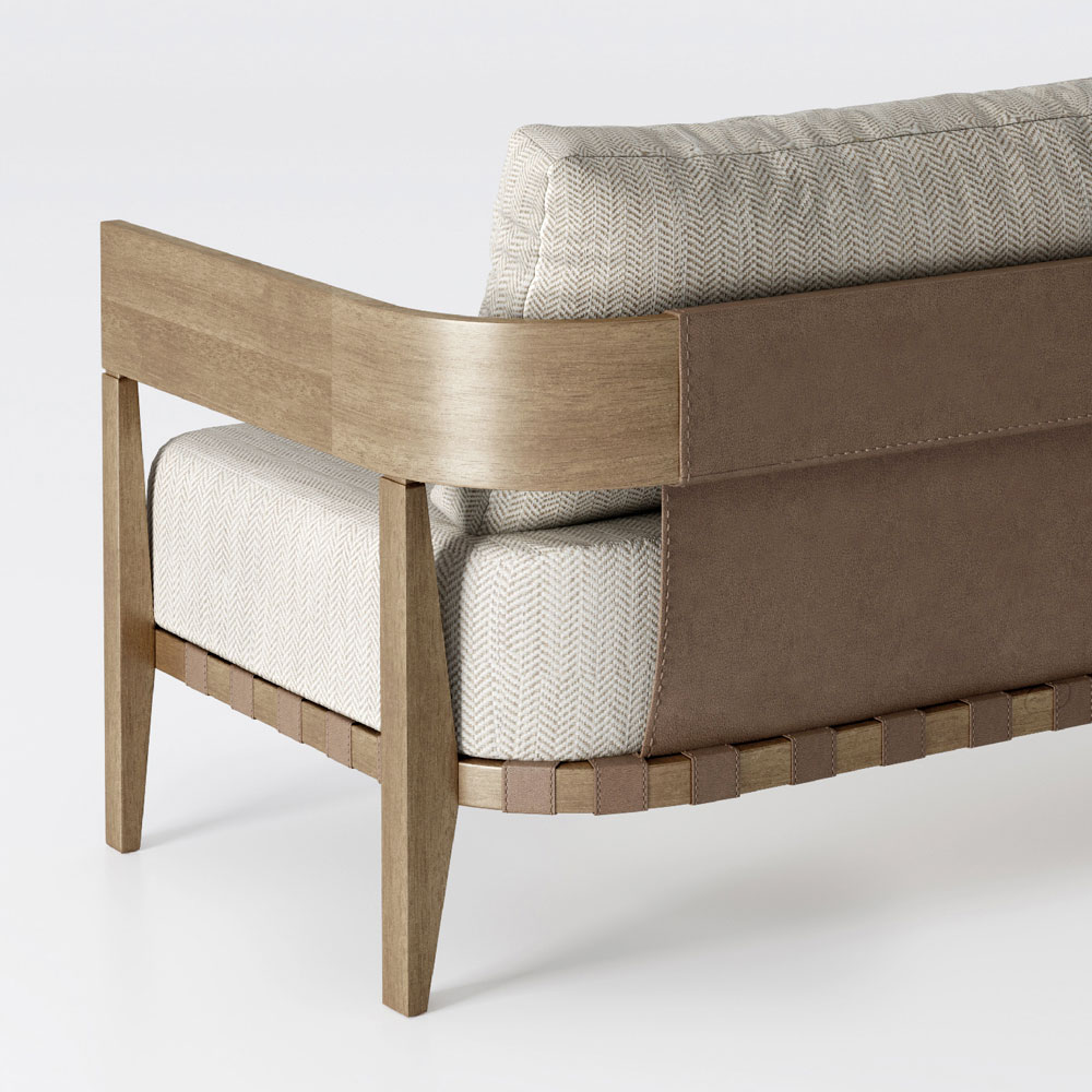 Sofá de exterior fabricado íntegramente en Italia con cojines de asiento y respaldo en tejido acolchado y estructura de madera de teca desgastada. El sofá está decorado en la estructura del asiento y en el respaldo con cuero cosido . Este producto de líneas delicadas y esenciales es perfecto para todos aquellos que aman el estilo moderno y minimalista. La forma orgánica y las patas esculturales se combinan para crear un elemento simple con proporciones armoniosas adecuado para ser insertado en cualquier ambiente exterior para dar un ambiente encantador con líneas simples y un gusto retro. Los materiales utilizados para la producción garantizan calidad y resistencia incluso con el paso del tiempo y hacen que este complemento de decoración sea perfecto para cualquier situación y ocasión de uso.