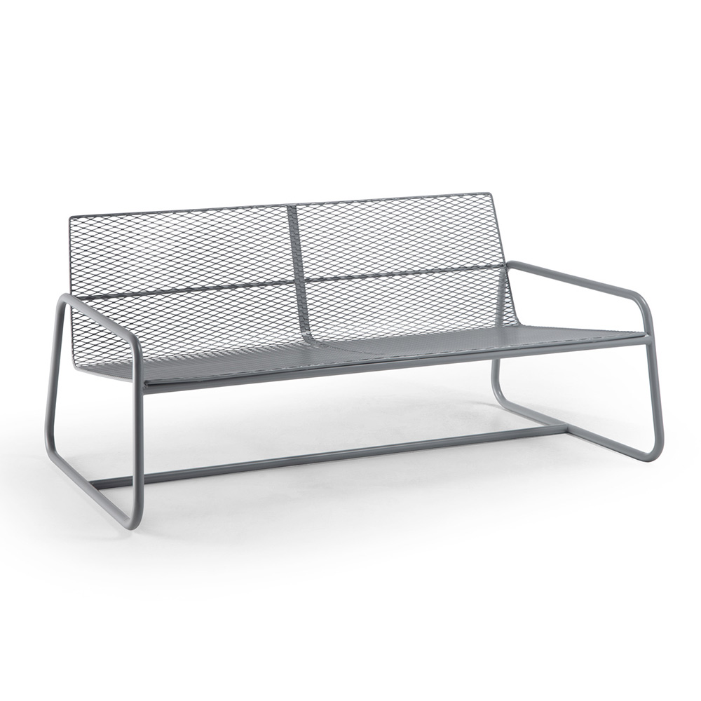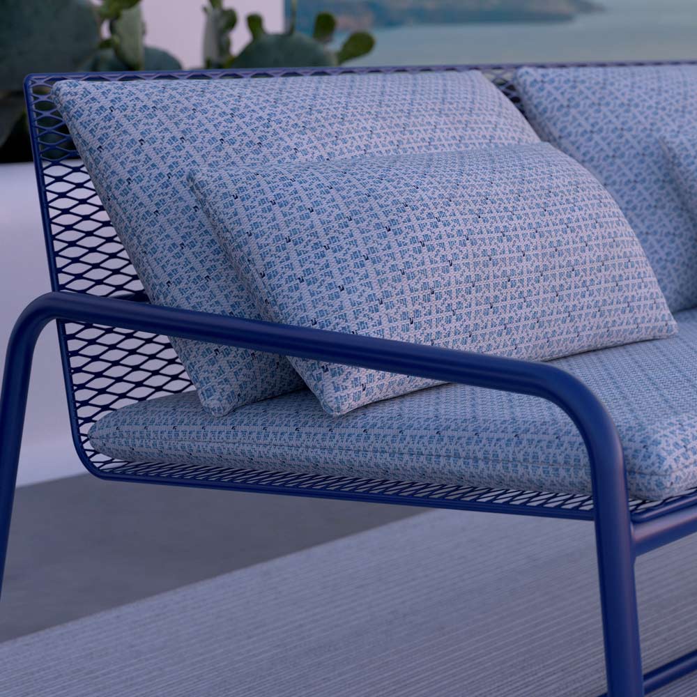 Sofá de exterior en metal con cojines de tela a juego disponible en varios acabados, artículo de lujo made in Italy.