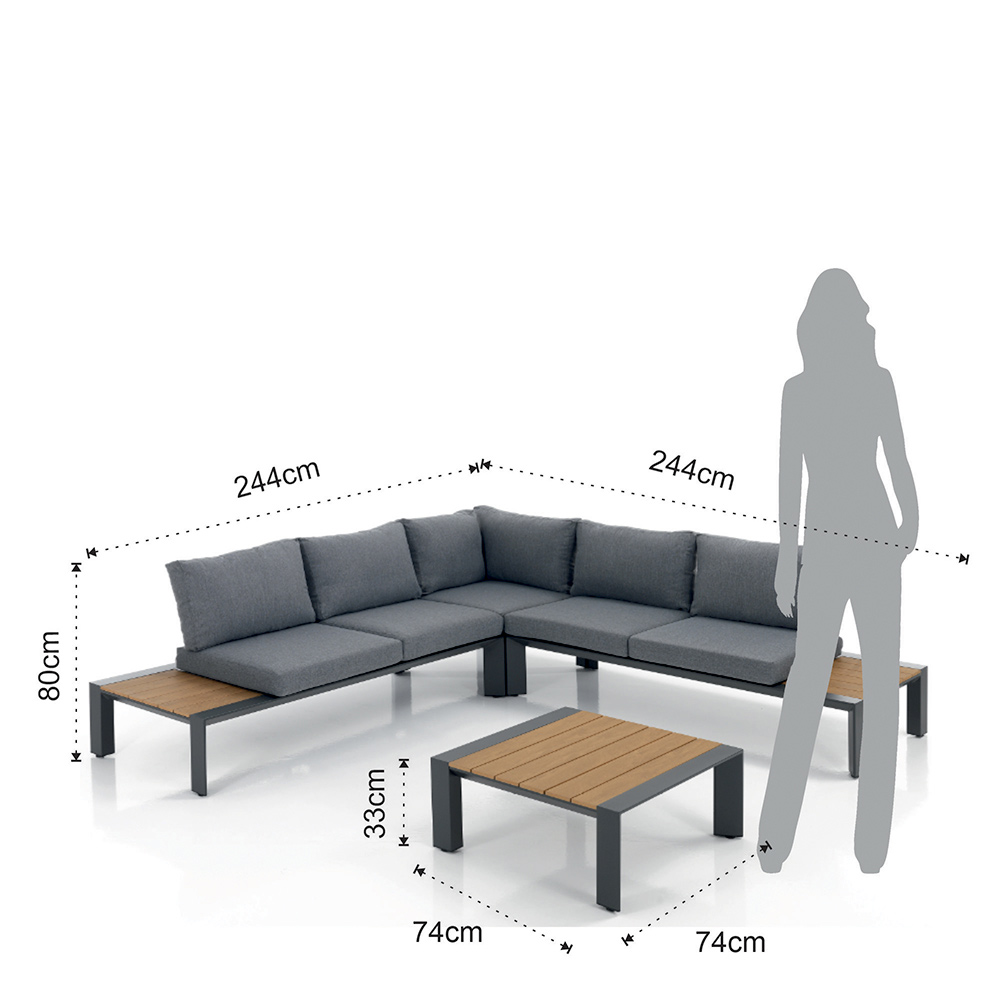 Este sofá esquinero y mesa de jardín representa la quintaesencia de una relajación elegante y un estilo contemporáneo. Con su estructura y líneas limpias, el sofá ofrece un contraste elegante y moderno con la cálida madera de los asientos y la superficie de la mesa, creando un ambiente acogedor que es a la vez atractivo y estéticamente agradable .
