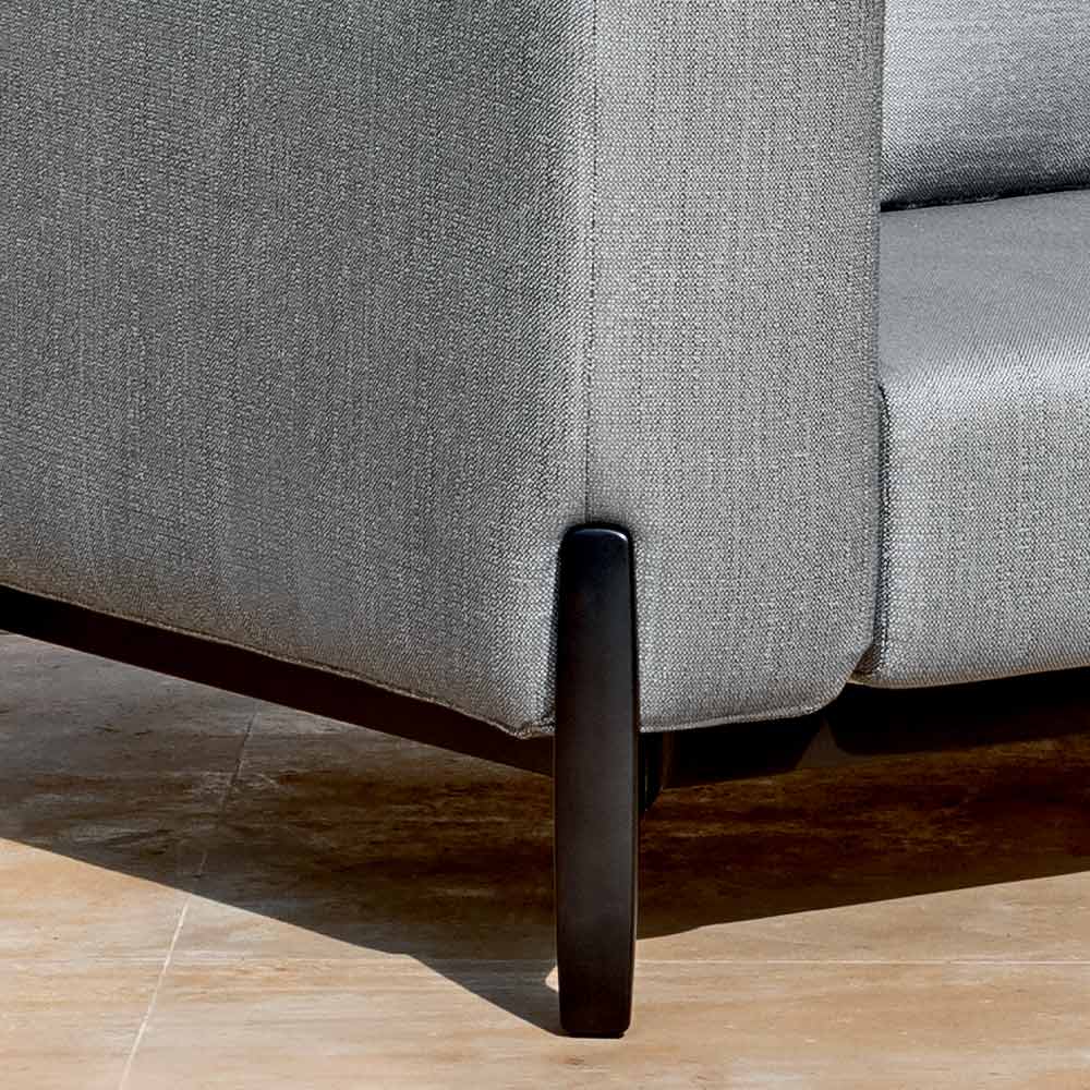 Es el detalle de la pata de aluminio fundido el que empuja el tapizado para dotar a este sofá esquinero para jardín de 5 plazas del refinado diseño que lo distingue y lo personaliza en su compostura formal.