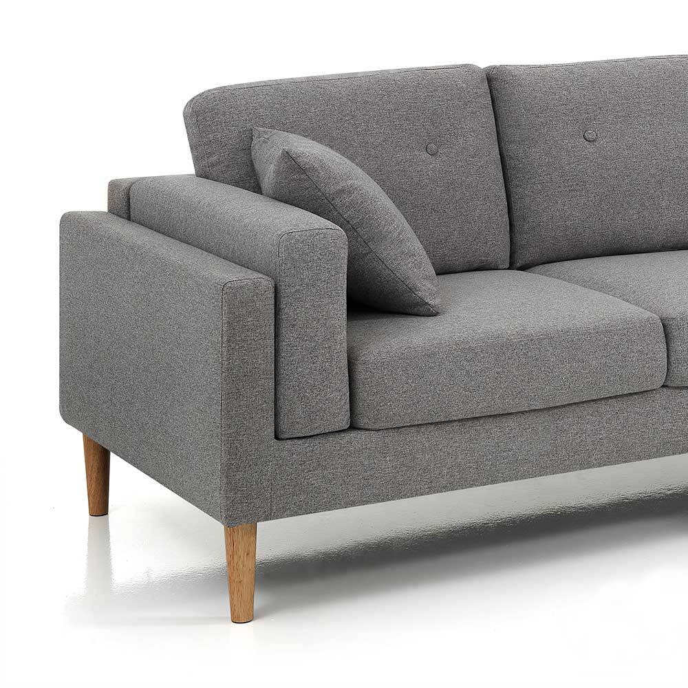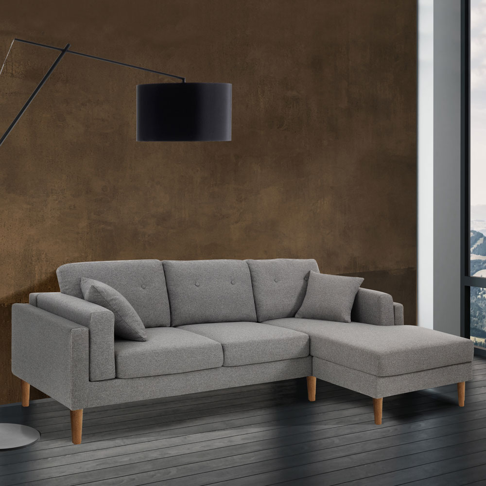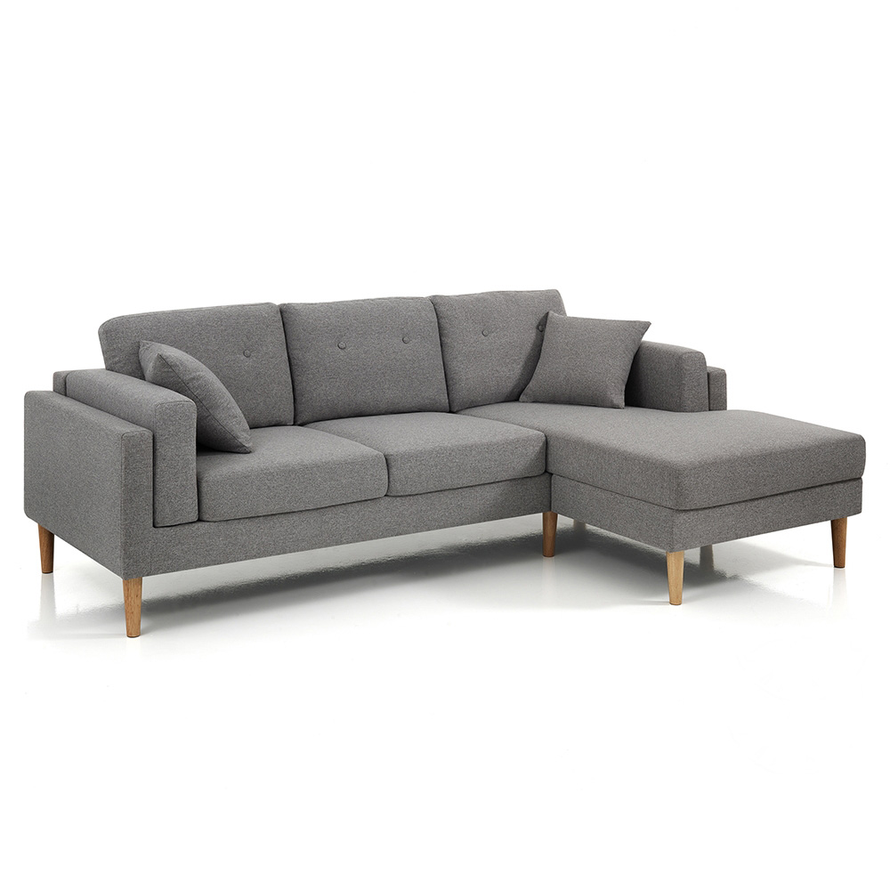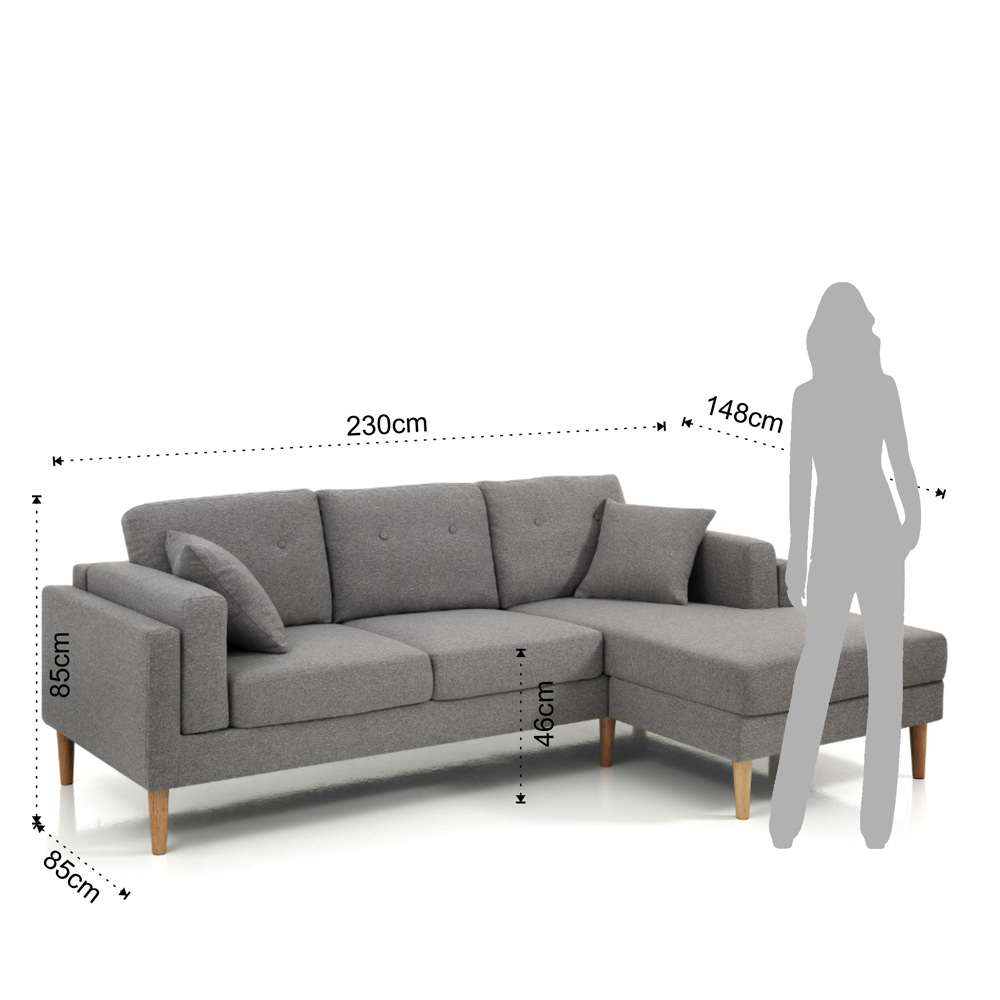 Sofá compuesto por asiento tapizado en tela gris con funda parcialmente desenfundable (sólo cojines de respaldo), patas de madera maciza acabado roble y 2 cojines decorativos de 40x40 cm totalmente desenfundables . Este producto encarna todo el confort y funcionalidad para regalarte momentos de tranquilidad y relajación. El asiento confortable y envolvente garantiza un confort único en su género. Gracias a sus acabados, es un sofá que capta la mirada de quien entra en la estancia, convirtiéndose en protagonista del ambiente cotidiano o contract.