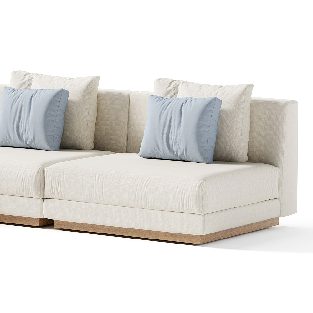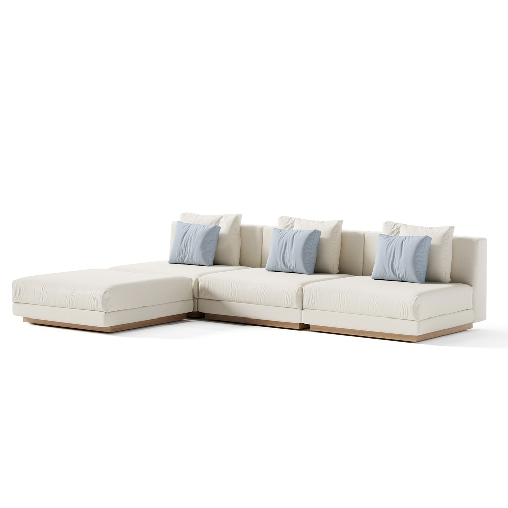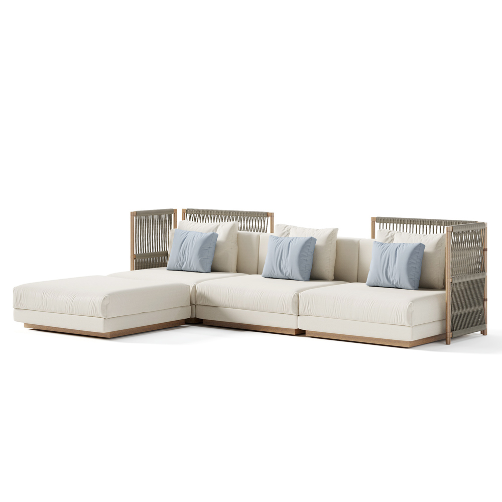 Sofá de jardín modular íntegramente fabricado en Italia con cojines de asiento y respaldo en tejido acolchado. El producto se compone de un asiento bajo y profundo y gracias a los grandes cojines se convierte en un sistema atractivo y acogedor diseñado para crear un ambiente relajado e informal. Este sofá es perfecto para hacer único cualquier ambiente, ofreciendo la libertad de reescribir tus espacios de vida con gusto y estilo. Gracias a sus acabados simples y lineales, garantiza elegancia y refinamiento a cualquier ambiente en el que se coloque. La variante con estructura de madera de iroko y tejidos de cuerdas verdes , gracias a su decoración recuerda la tradición artesanal del tejido y da un toque de identidad única a la composición sin dejar de ser un elemento meramente decorativo. Esta estructura también se puede utilizar como boiserie divisoria independiente.