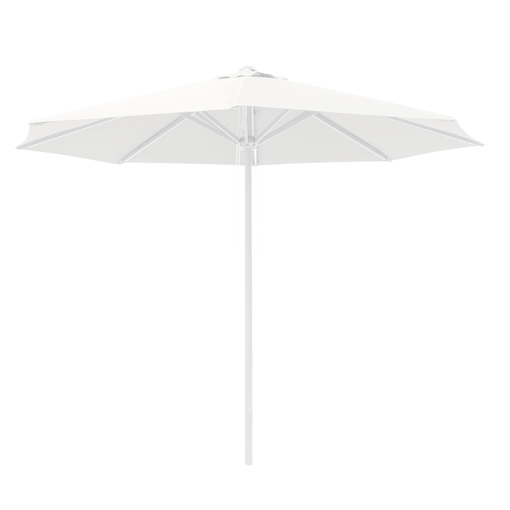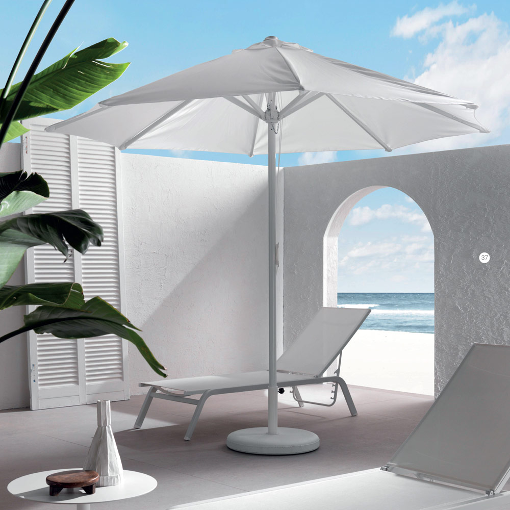 Sombrilla de jardín con estructura fabricada en aluminio pintado de blanco ytoalla enacrílico. Sencilla pero funcional, esta sombrilla de carácter y diseño actual , se adapta a la perfección a cualquier situación exterior como piscinas, jardines y terrazas, consiguiendo ofrecer una excelente protección frente a la acción del sol, enriqueciendo la estética del entorno de forma delicada y dando frescura en los calurosos y soleados días de verano.