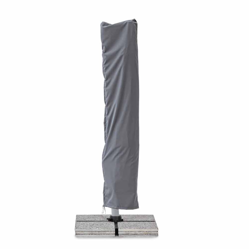 Estructura en aluminio anodizado . Poste de 93x57mm. 8 varillas 28x18mm. Lámina de poliéster gris oscuro de 250gr / m2 con revestimiento de pa (poliamida). Base cruzada en acero . Poste giratorio de 360 ° con pedal. Inclinación vertical con asa de 5 posiciones. Incluye funda de paraguas.