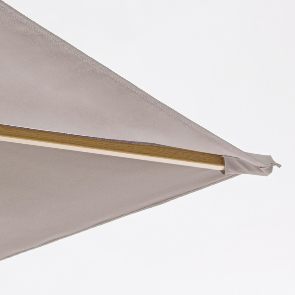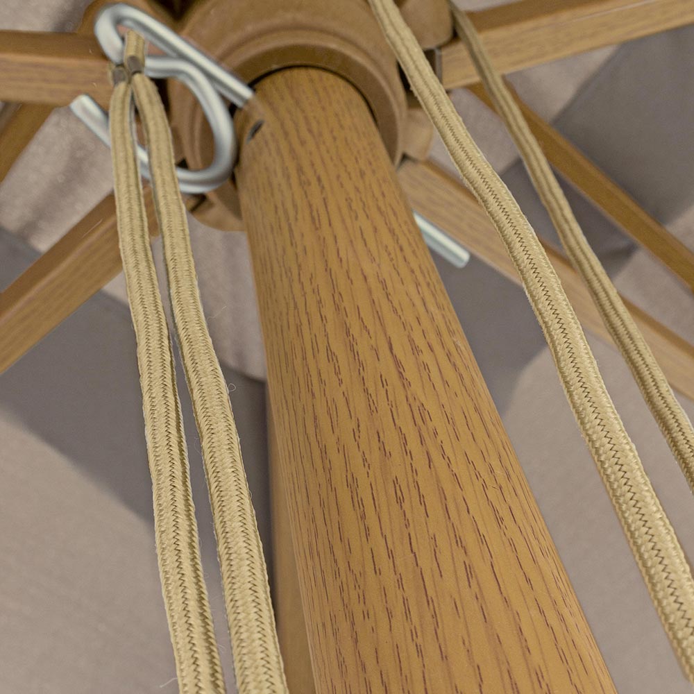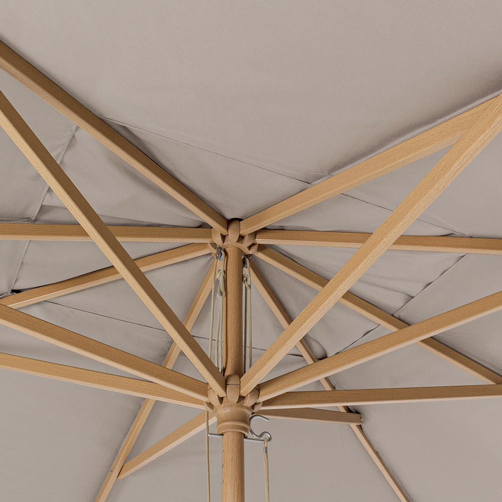 Estructura de aluminio con acabado efecto madera. Corona de plástico. Poste Ø48 x 1.8 mm. 8 varillas 20x30 mm. Lámina de poliéster de 235 gr / m2. Base no incluida.