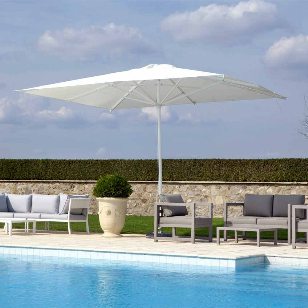 Sombrilla de tela acrílica y metal con recubrimiento en polvo, poste tubular de aluminio de Ø60 mm, varillas tubulares de liberación rápida de aluminio decoradas con ranuras, tapones de plástico PE, cuello, corona y punta de nylon. Su estructura de mástil central telescópico tiene un mecanismo de apertura / cierre de polea y está equipada con una cuerda trenzada (100% poliéster) y un carrete de cuerda para bloqueo. Sencillo, funcional y con un diseño moderno, este mueble se adapta a cualquier situación exterior como piscinas, jardines y terrazas de forma impecable, consiguiendo ofrecer una excelente protección frente a la acción del sol y al mismo tiempo enriqueciendo la estética. del entorno de forma sencilla y con personalidad. Base no incluida.