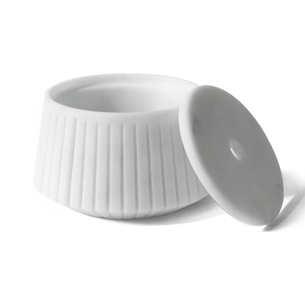Esta caja de almacenamiento decorativa es un objeto de uso diario en mármol de Carrara finamente trabajado capaz de dar singularidad al espacio a través del diseño y los fuertes elementos decorativos.