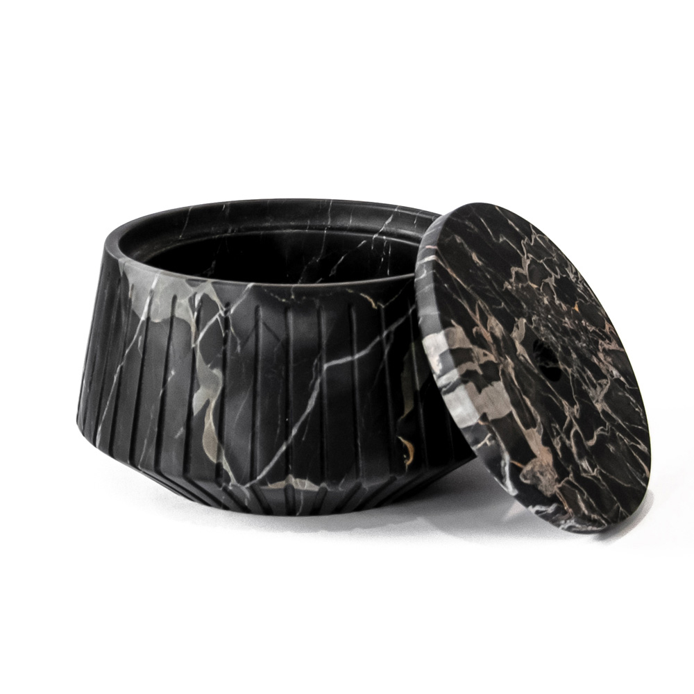 Porta objetos a rayas en mármol blanco de Carrara o diseño Portoro negro fabricado en Italia.