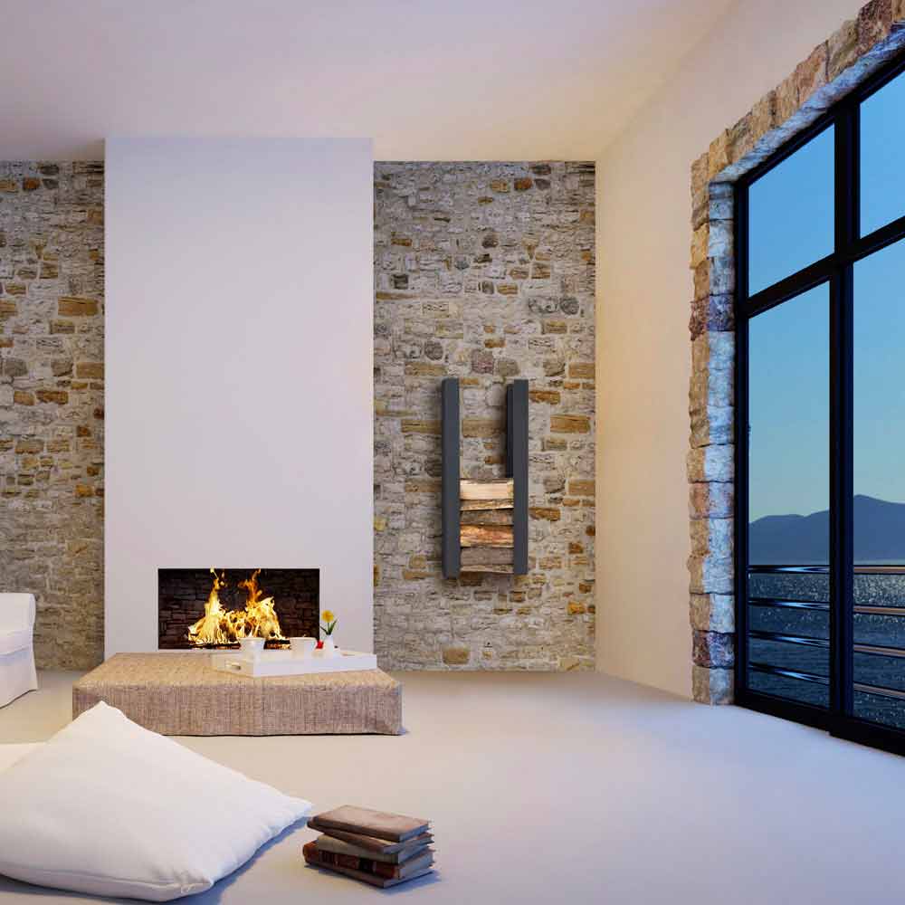 Porta troncos de acero negro de diseño moderno para pared o suelo con accesorios, fabricado en Italia.