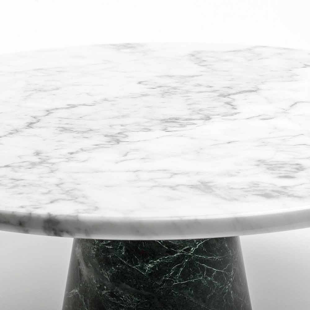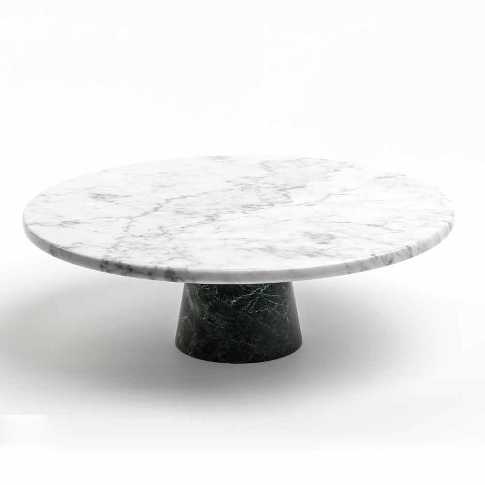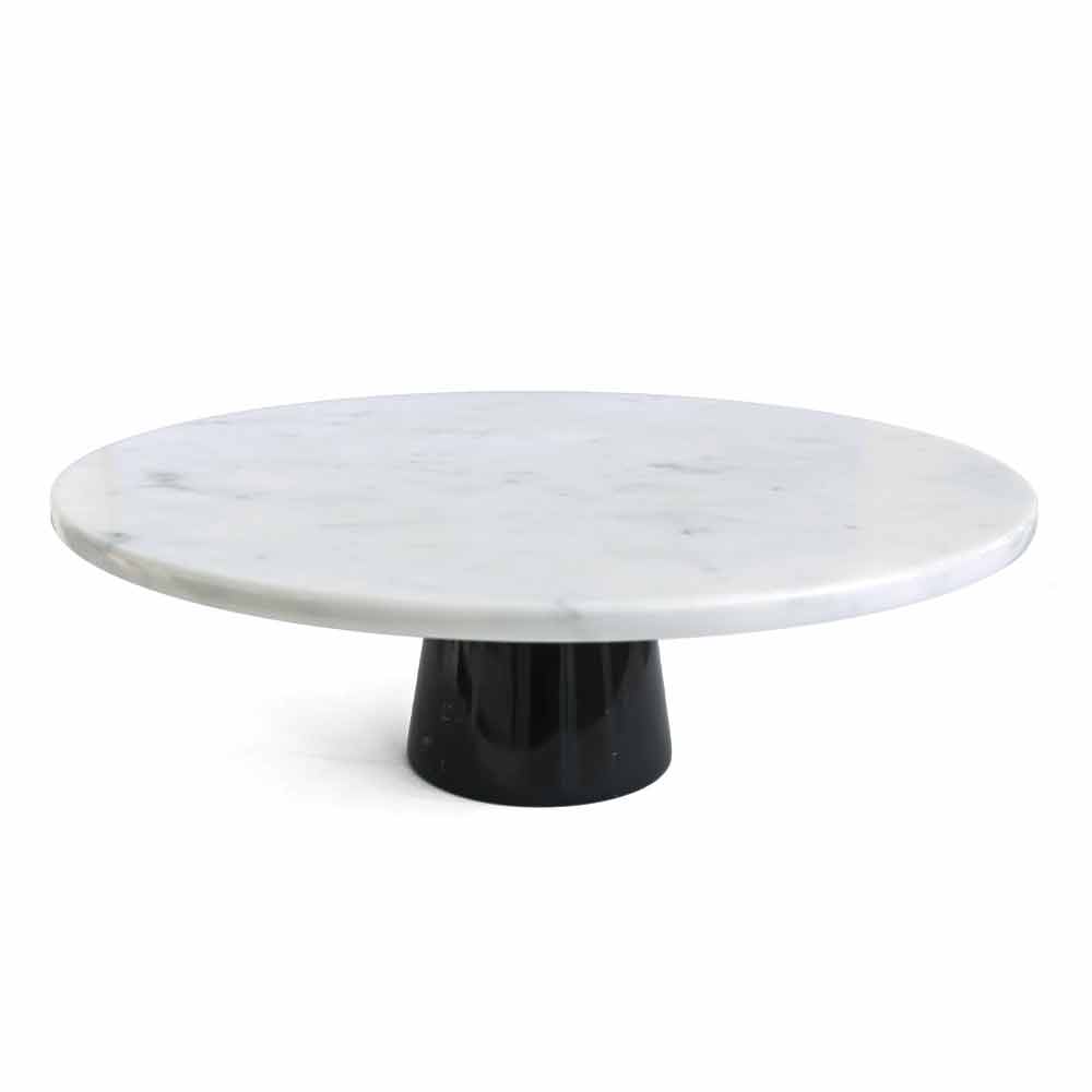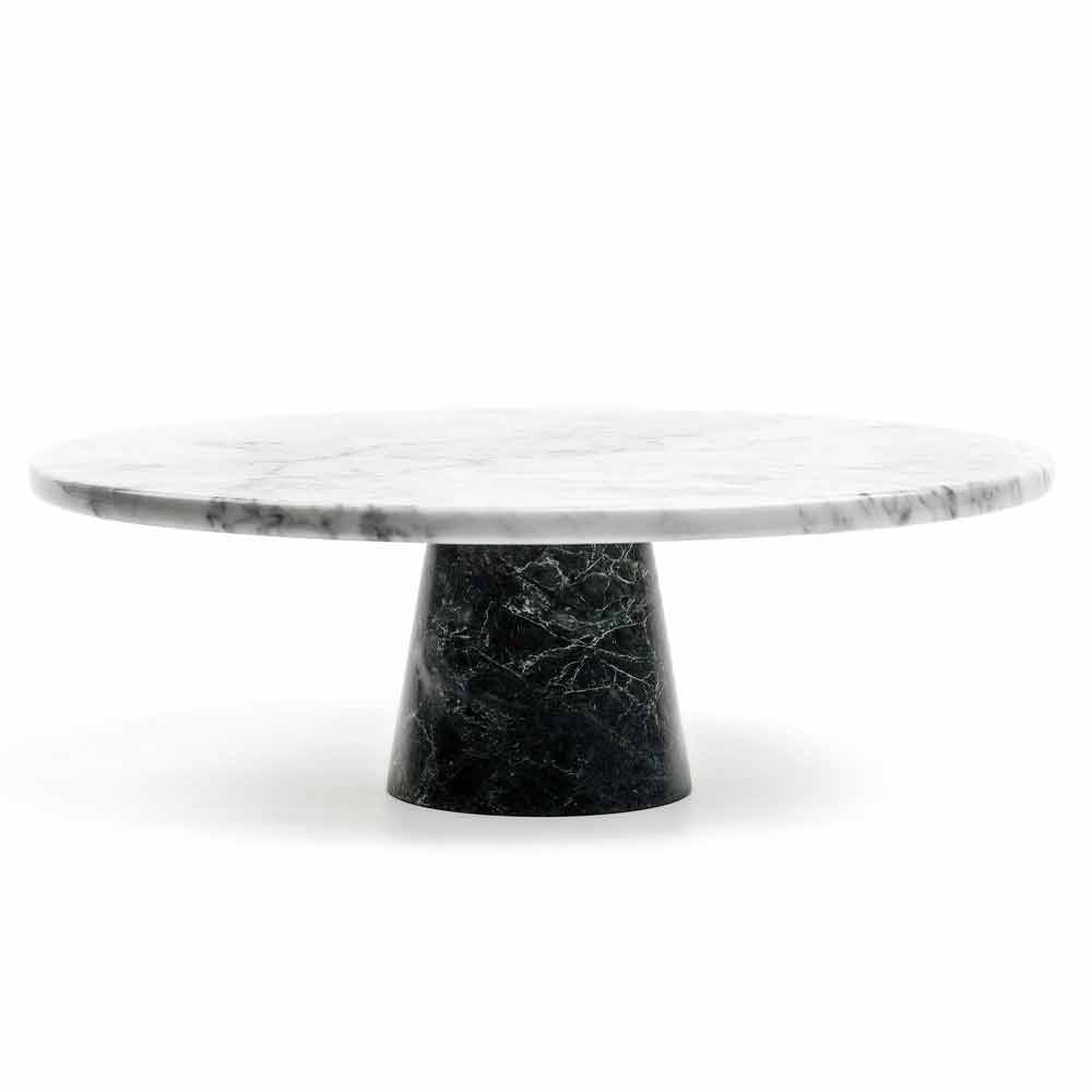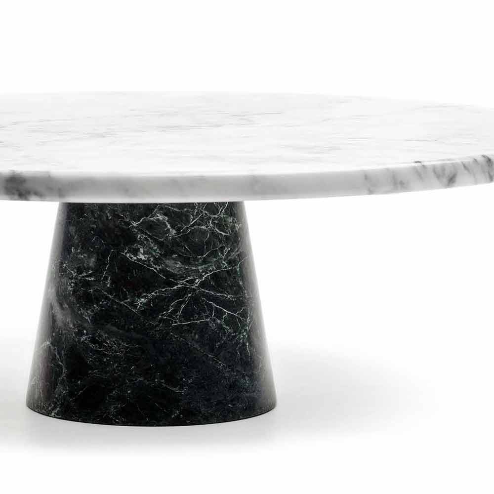 Soporte de pastel moderno y elegante con tapa de mármol blanco de Carrara y base de mármol negro de Marquinia . Hecho de mármol fino de alta calidad. Es una pieza única ya que cada bloque de mármol utilizado se diferencia de los demás por vetas y matices.