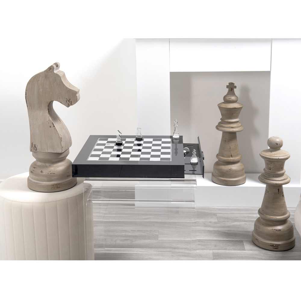 Este tablero de ajedrez y damas está hecho a mano en plexiglás 100% de polímero virgen con técnica láser. Gracias a su diseño esencial y refinado y a los espléndidos detalles que lo componen, el tablero de ajedrez / damas se presenta como un verdadero mueble moderno y elegante con un lujo exclusivo. Perfecto como idea de regalo para los entusiastas de los juegos, el cajón de almacenamiento para los peones acentúa su practicidad. Artículo concebido, diseñado y fabricado en Italia , con materiales italianos.
