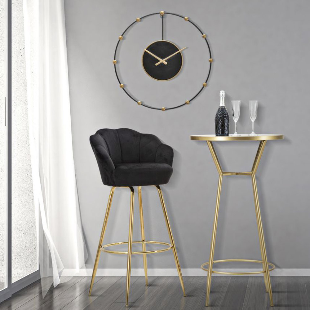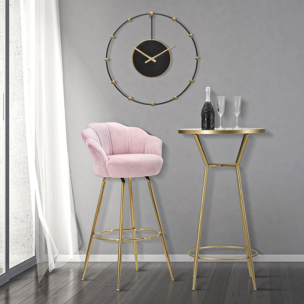 Taburete alto de barra en hierro dorado con asiento tapizado en tela.