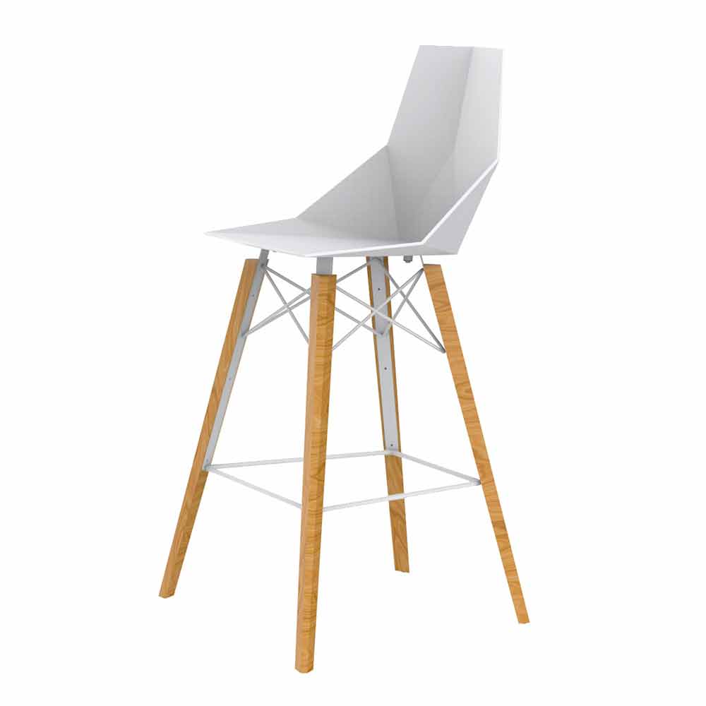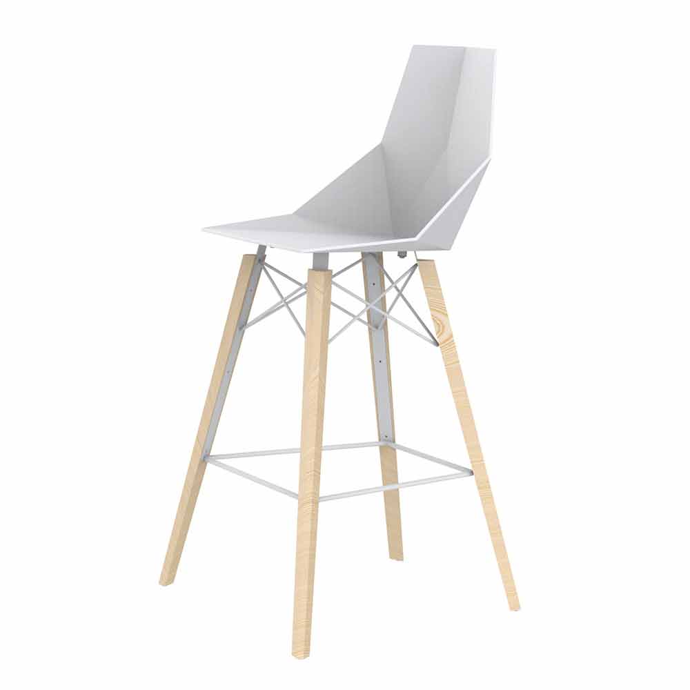 Taburete de bar con estructura en madera de fresno y asiento y respaldo en polipropileno en varios colores.