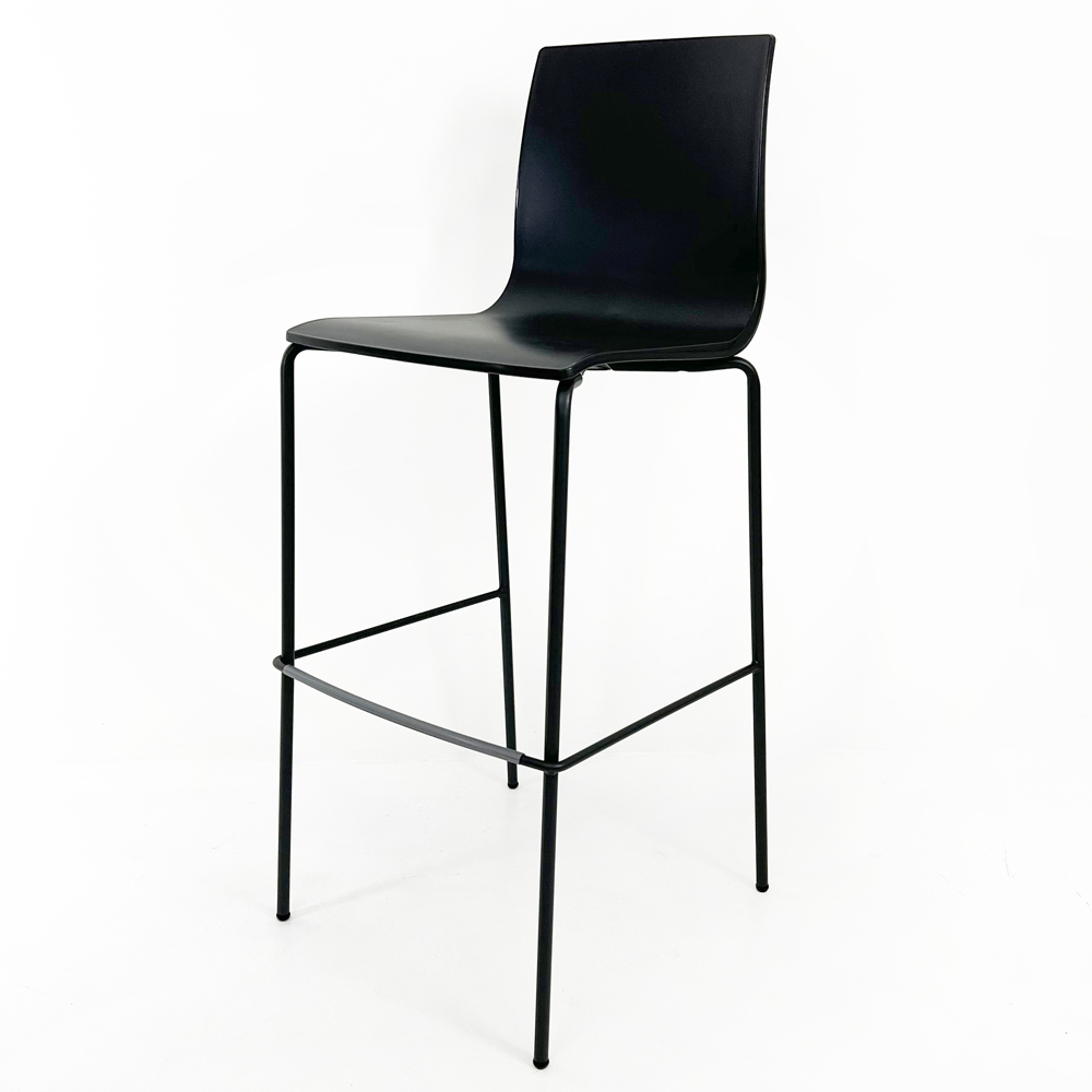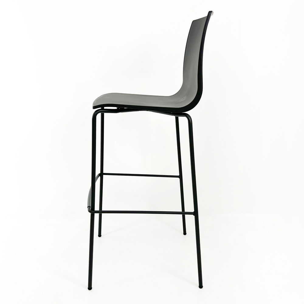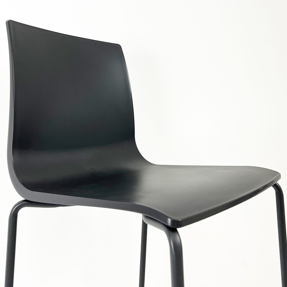 Taburete moderno fabricado en Italia, compuesto por una carcasa de tecnopolímero reciclable con acabado antracita y una estructura de 4 patas con reposapiés de acero tubular del mismo color que el asiento.con un diámetro de 16 mm que permite apilar hasta un máximo de 4 unidades.