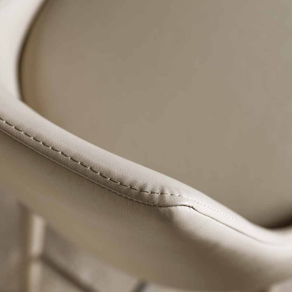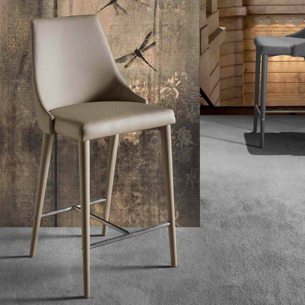 Aspectos subrayados por el respaldo e del reposapiés en acero natural. En cambio, la estructura es de metal pintado del mismo color, mientras que el asiento está hecho de cuero ecológico.
