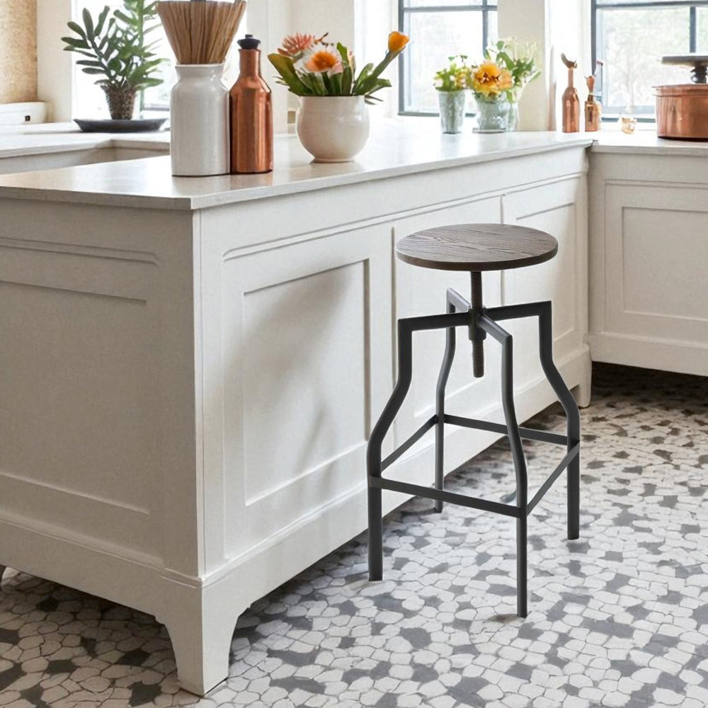 Cuenta con una estructura metálica pintada en negro de estilo industrial y un asiento de nogal industrial, ajustable en altura hasta un máximo de 76 cm. Consigue el máximo estilo y comodidad con este taburete.