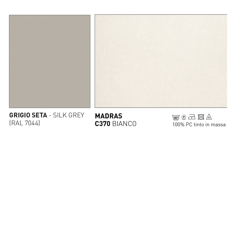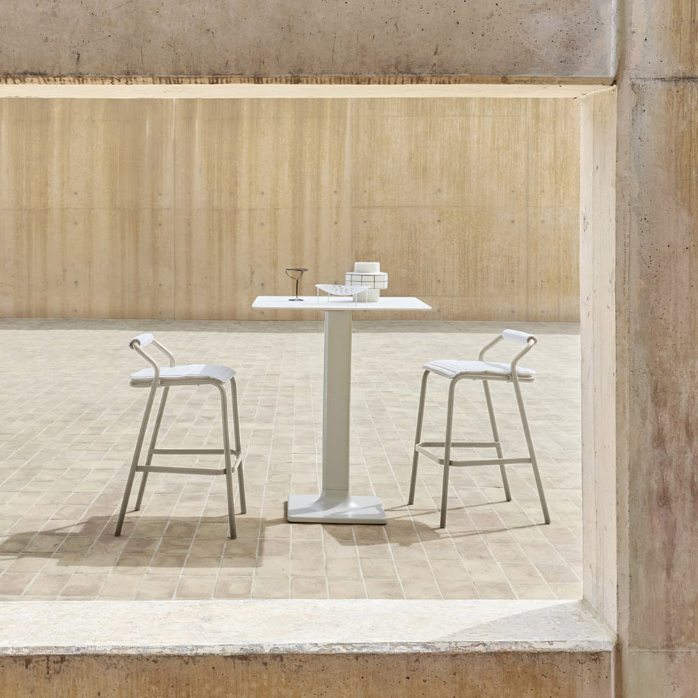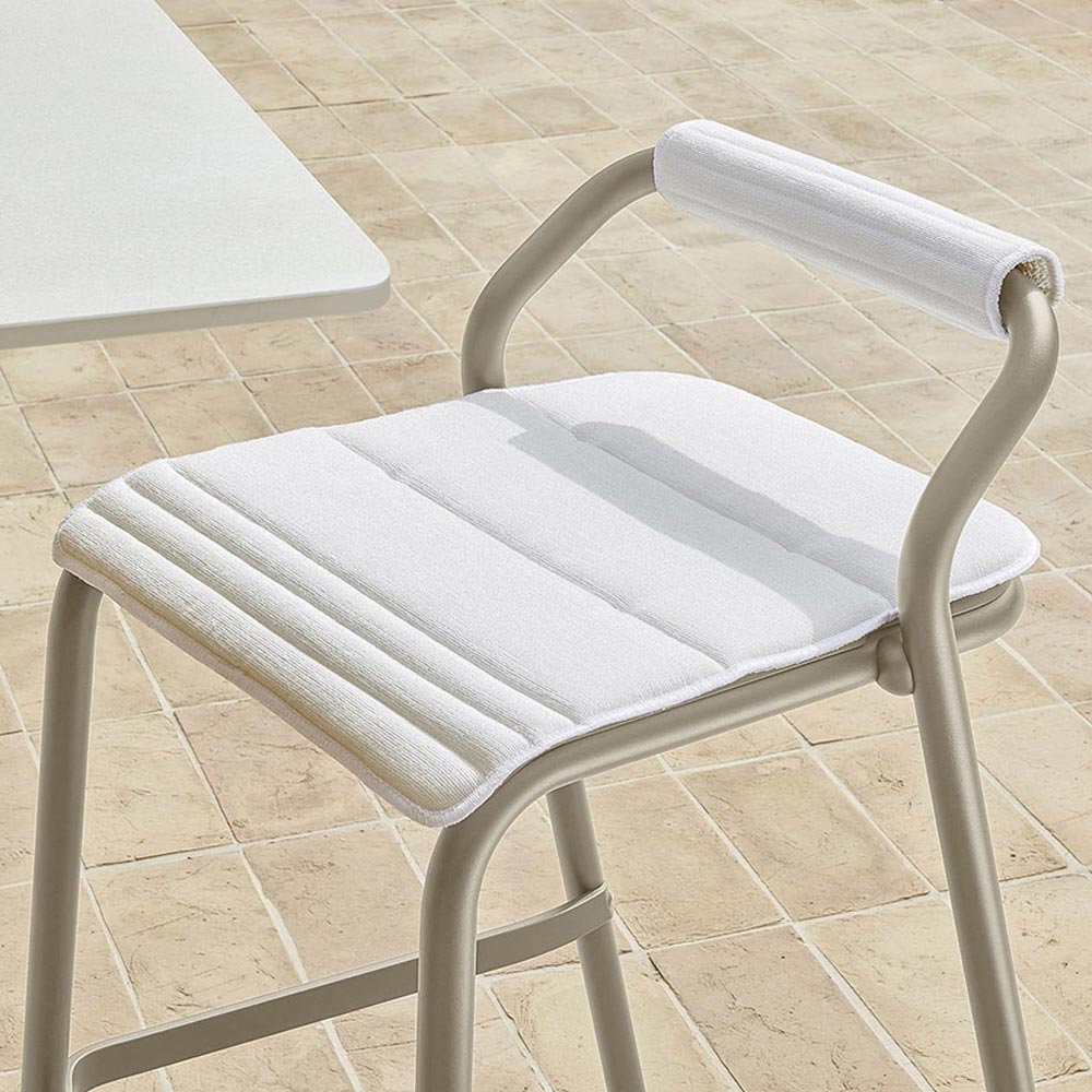 Taburete de exteriorfabricado íntegramente en Italia con estructura en tubo de aluminio pintado con polvo epoxi en acabado gris seda y asiento completo con cojines de asiento y respaldo blancos acolchados con goma dryfeel . Este moderno mueble está diseñado para ofrecer un confort óptimo a la vez que ayuda a completar el ambiente exterior gracias a su elegante estética .