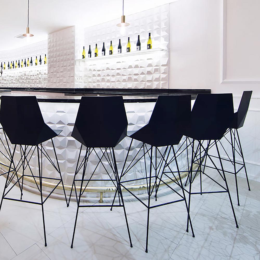 Taburete de jardín colección Faz de Vondom, en polipropileno y acero inoxidable La colección Fax by Vondom fue diseñada por el diseñador Ramòn Esteve, arquitecto de la armonía, la serenidad, la atemporalidad y la universalidad que creó formas minerales y rotundas. Un ambiente del que surge la feliz combinación de material e iluminación. Su espíritu se vive exclusivamente en la calidad del material que les permite ser utilizados incluso en los entornos más exigentes. La modularidad de Faz permite al consumidor adaptar el mueble a su estilo y necesidades sin perder la armonía de este mueble. El resultado es un producto que transmite esencia, que contiene la complejidad y densidad de un trabajo encaminado a crear lugares deseables para vivir. El taburete Faz es un objeto de diseño moderno, en polipropileno y acero inoxidable. Se trata de dos materiales resistentes a los impactos y de fácil mantenimiento. Disponible en los siguientes colores: blanco, negro, crudo, rojo y bronce.