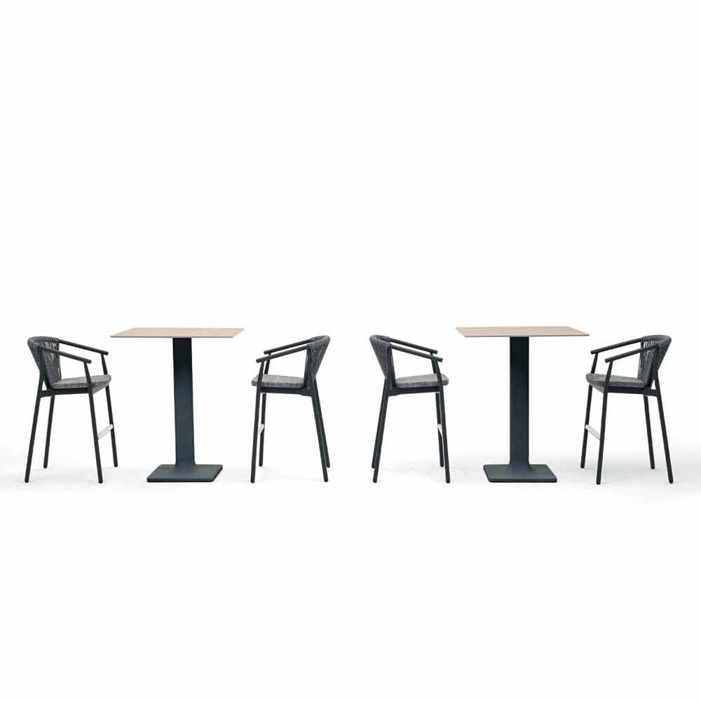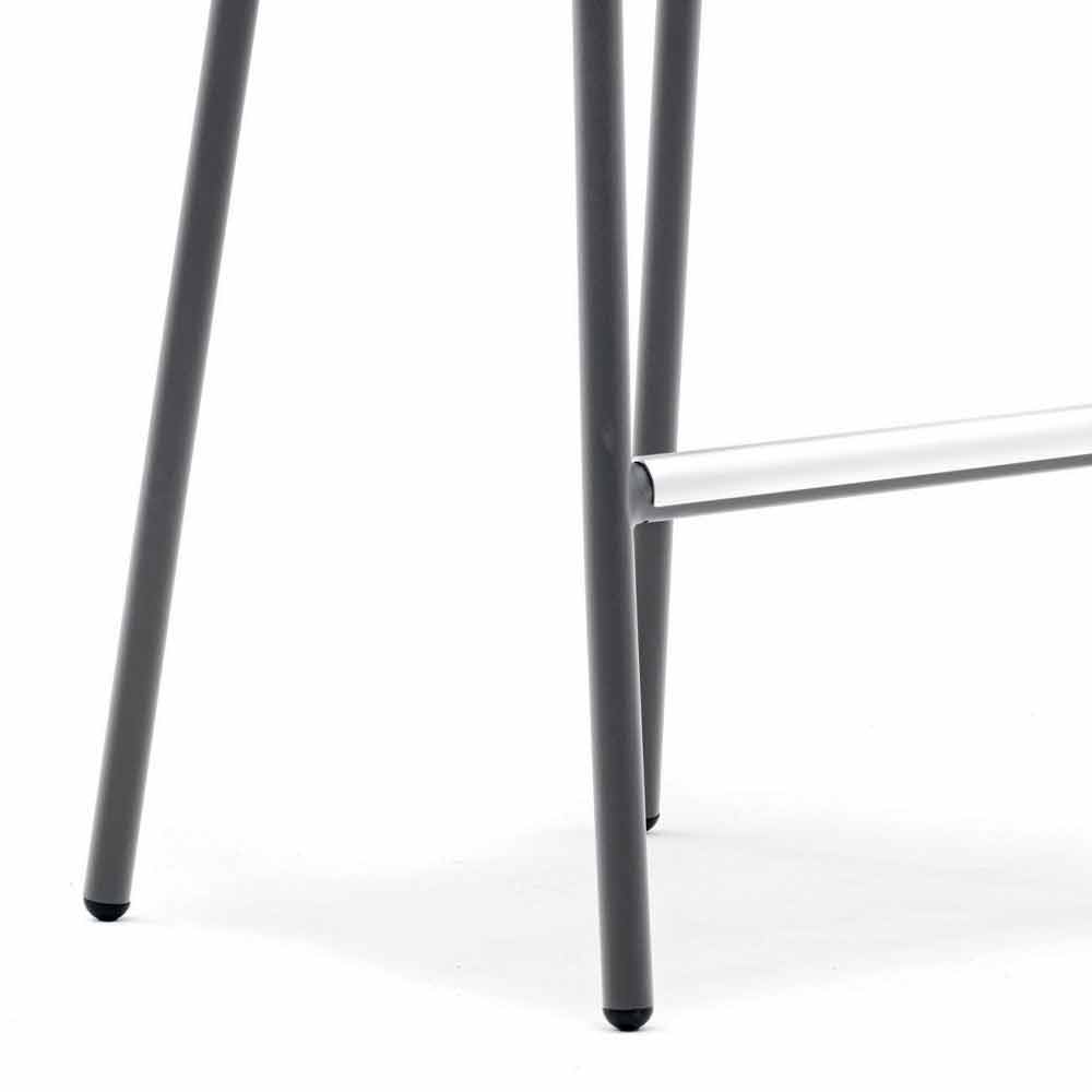 Taburete apilable de diseño moderno para exterior con base de aluminio y asiento en tejido técnico blanco o ceniza.