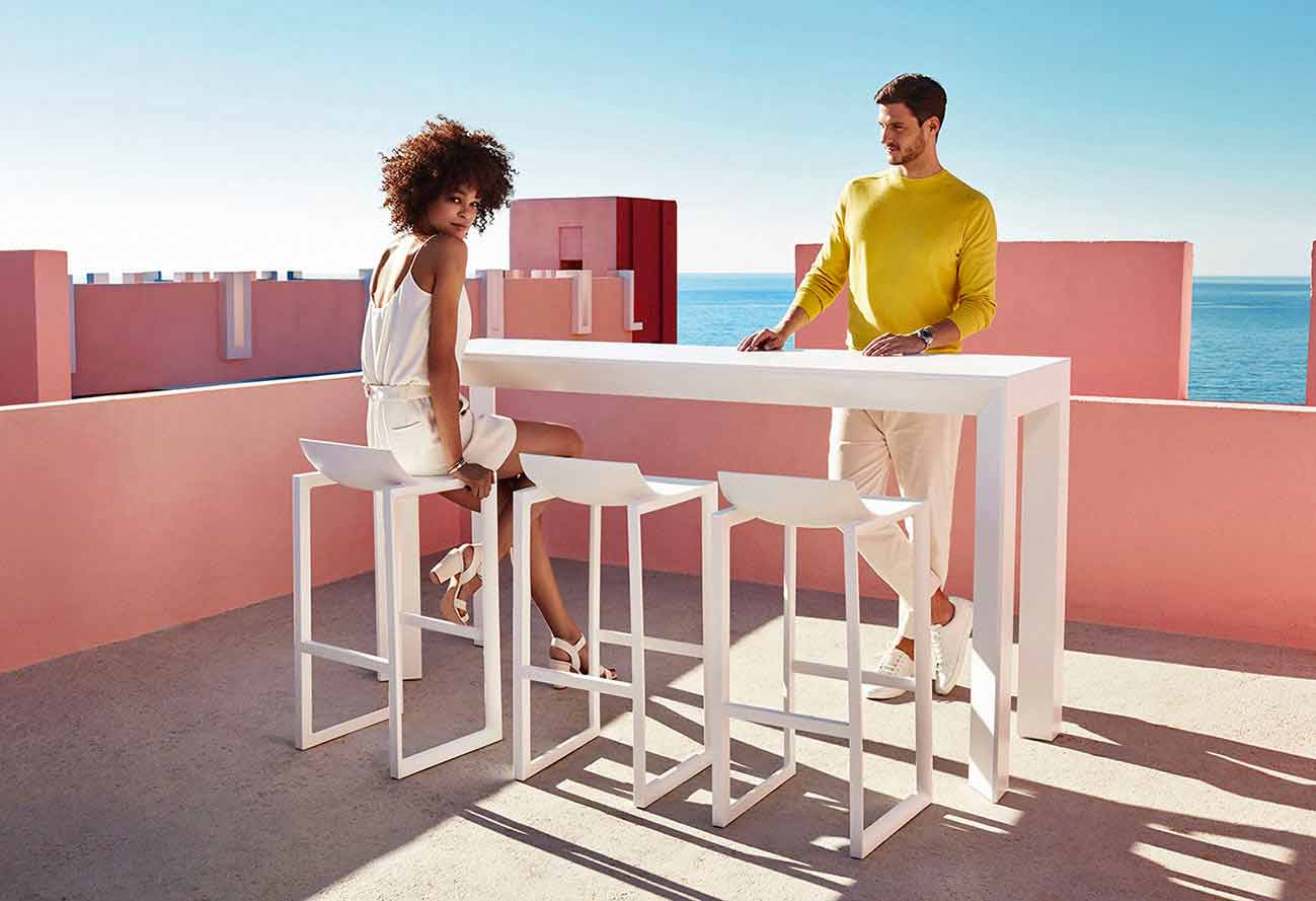 Taburete exterior Wall Street de Vondom, en polipropileno y fibra de vidrio.