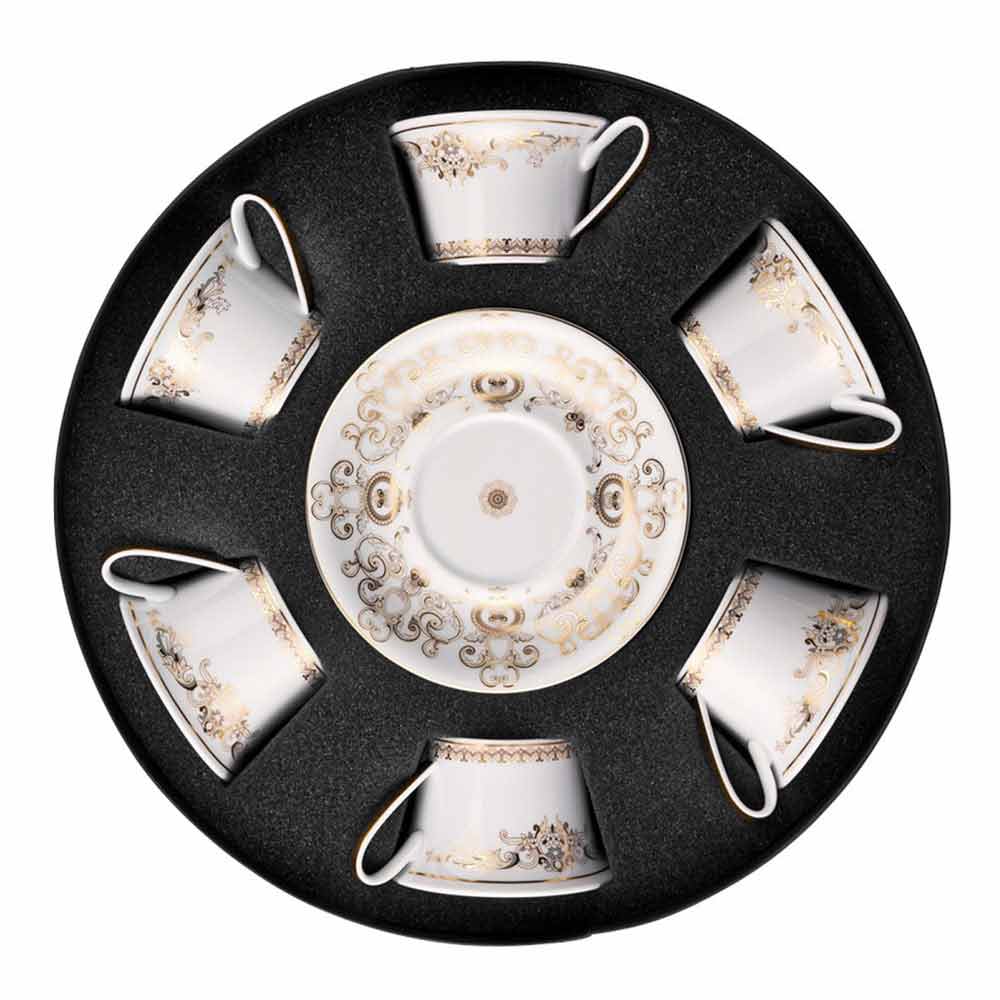 Este juego de 6 tazas de té contiene todo el refinamiento y el lujo de la nueva colección de vajilla Medusa Gala , que reinterpreta los motivos tradicionales de Versace en su diseño y decoración: el icono que representa a Medusa se alterna con refinados ornamentos barrocos en una preciosa filigrana de oro. Un emocionante efecto de contraste entre la blancura de la porcelana y el oro puro da vida a una mise en place perfecta, moderna y al mismo tiempo singular.
