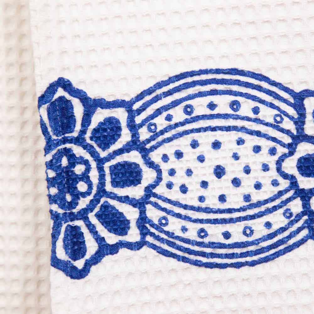 Toalla de baño en color blanco de alta artesanía italiana en puro algodón de nido de abeja impreso a mano con antiguo dibujo azul de un friso ornamental del siglo XVIII, pieza única en el mundo.