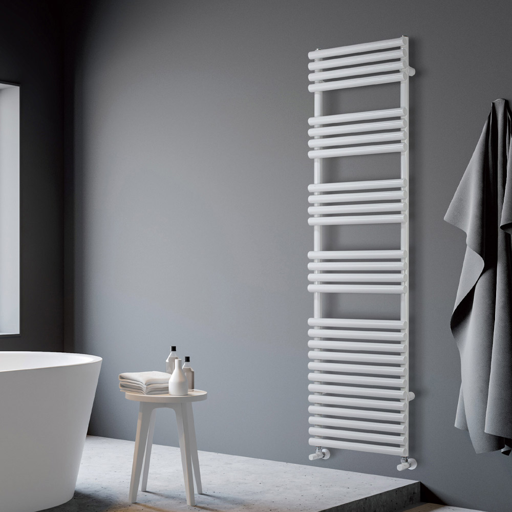 Toallero hidráulico de acero al carbono con acabado blanco brillante, compuesto por una serie de elementos horizontales de 3,5 cm de diámetro soldados a colectores verticales de 3,5 cm de diámetro, fabricado íntegramente en Italia, con kit de fijación a la pared, válvula de ventilación y tapa ciega incluidos .
